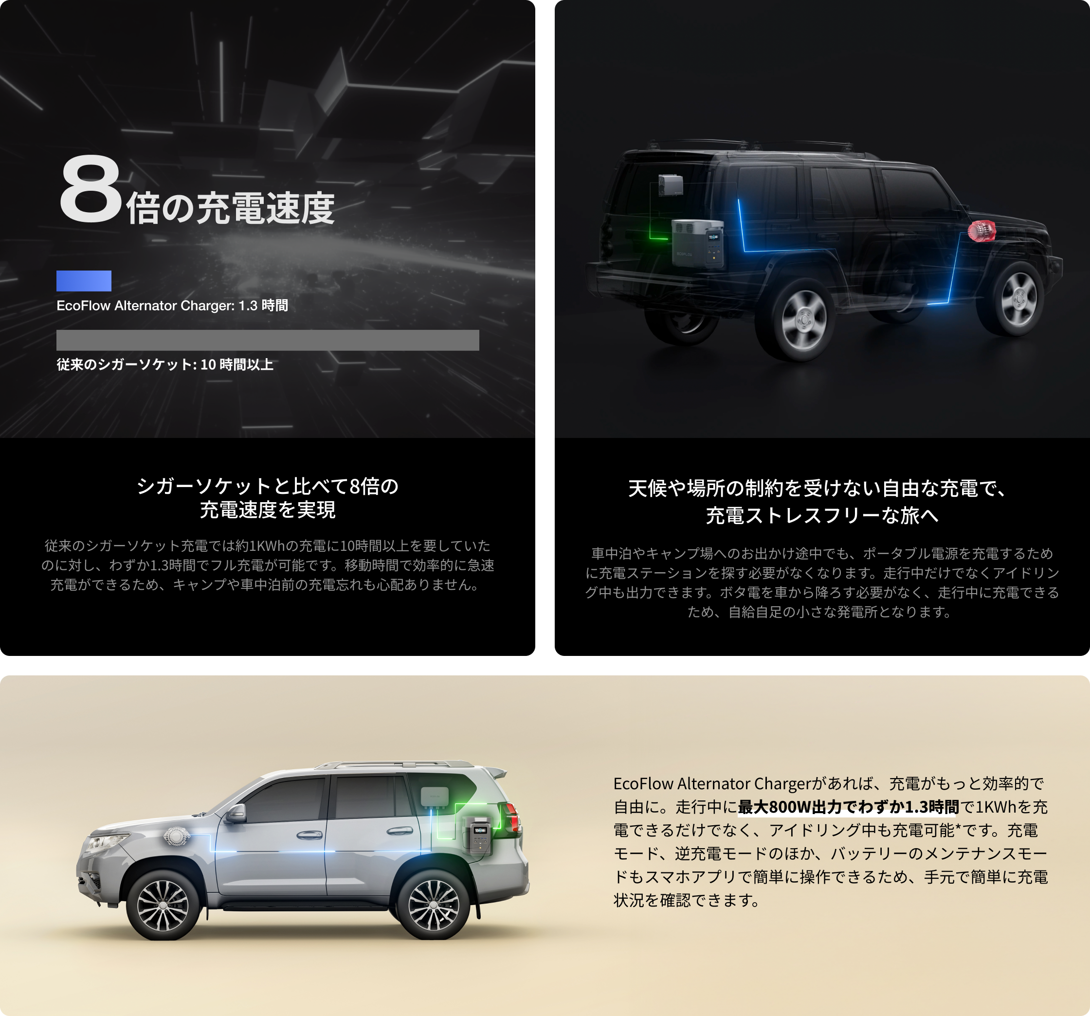 EcoFlow 800W Alternator Chargerは、従来のシガーソケットによる走行充電と比べて8倍の高出力で走行充電ができる革新的なソリューションです。
