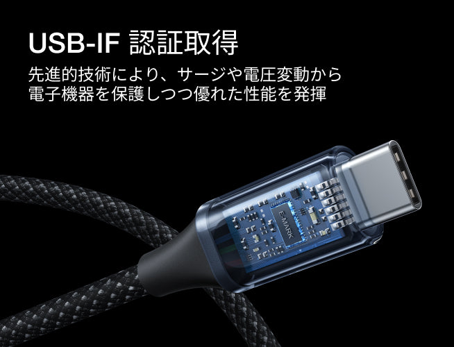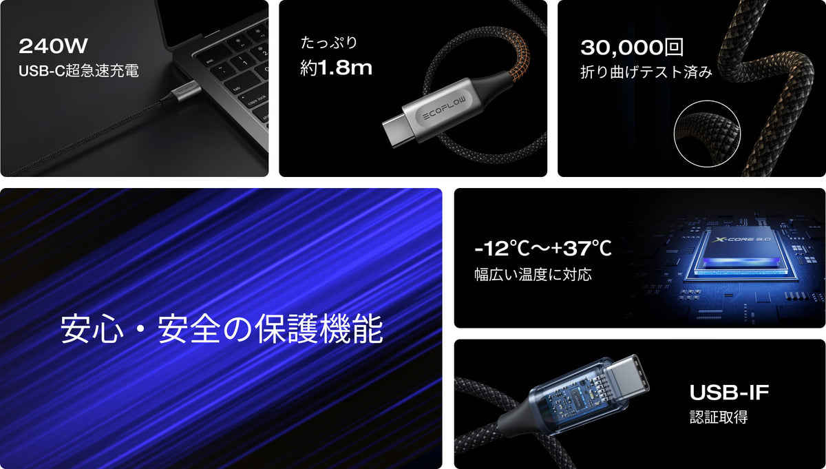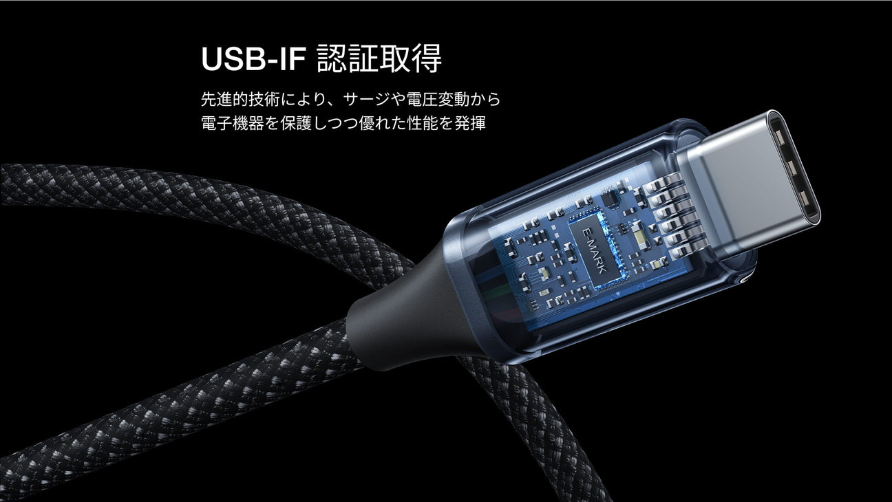 また、30,000回の折り曲げテスト済み(業界標準約5,000回)で、標準的なケーブル(最大40kgの荷重耐性)²と比較して断線のリスクを大幅に低減しています。汚れや指紋が付きにくいケーブルとアルミニウム合金製のコネクターを組み合わせることで、長期間にわたり使用可能です。