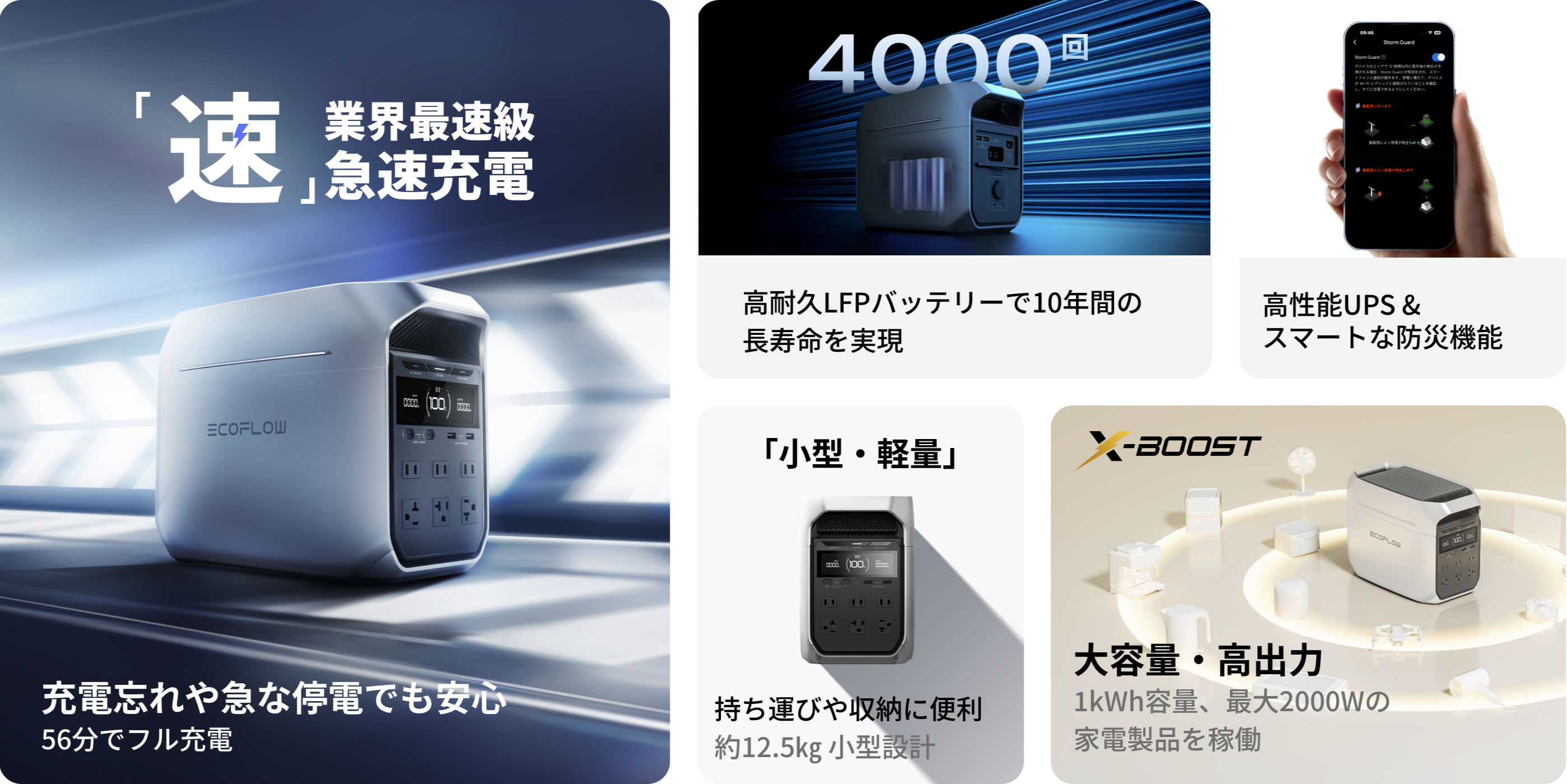 業界最速クラスの急速充電により、お出かけやキャンプ前の充電忘れや、急な災害予報が出た場合でも、