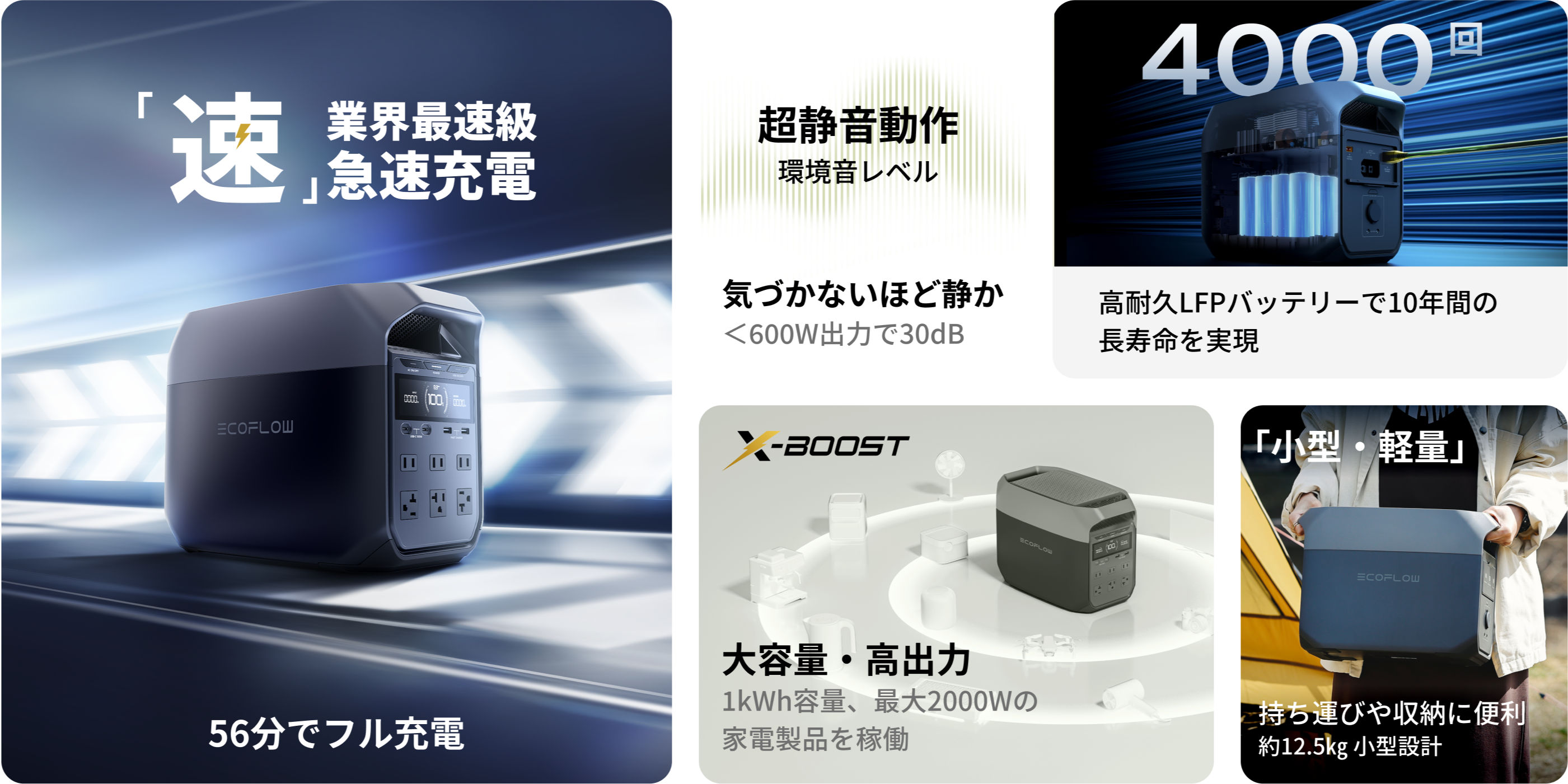 EcoFlow独自のX-Stream機能と1500W AC入力により、40分で80%、56分でフル充電可能。
