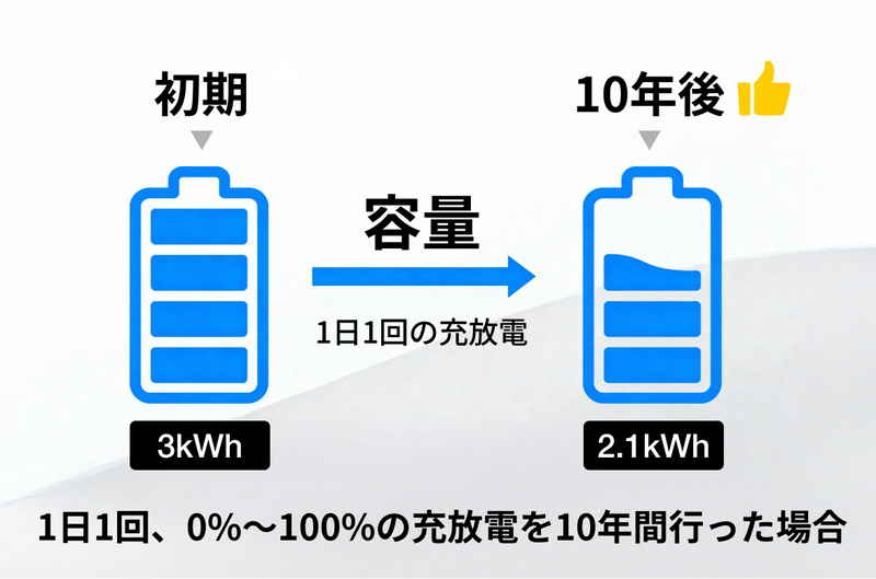 *2100%に近い満充電の状態で長期間保管すると、バッテリー内部で高電圧が維持され、化学変化が促されるため、劣化が早く進みます。