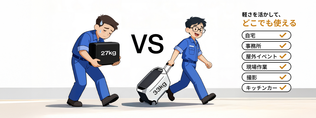 大容量のポータブル電源で課題となる「持ち運び」を一体型ハンドル&キャスターで解消。まるでスーツケースのように引っ張るだけでスムーズに移動できるため、屋内はもちろんキャンプ場や撮影現場、工事現場まで、幅広いシーンで快適に動かして活用できます。