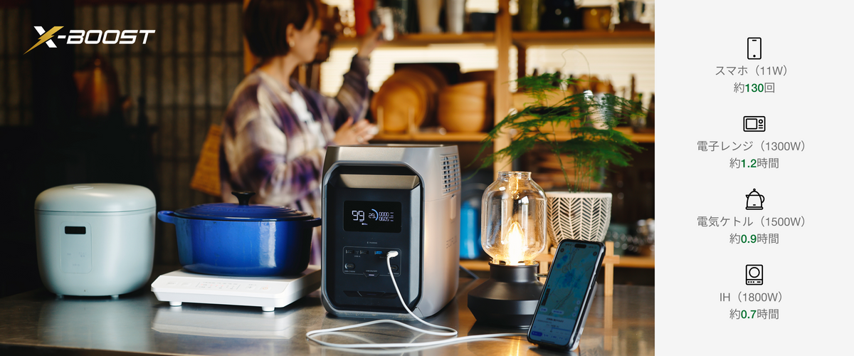 もちろん、電気ケトルや電子レンジ、ヘアドライヤーなど高出力の家電もしっかり稼働できます。さらに、独自のX-Boost機能で最大