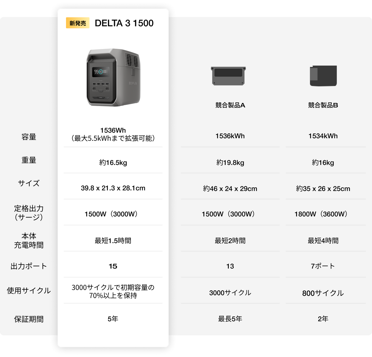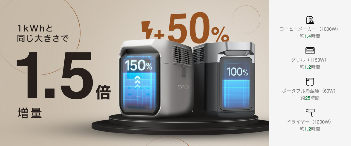 1kWhクラスの製品とサイズはほとんど変わらず、容量は1.5倍に。持ち運びや収納の便利さはそのままに、電化製品を1.5倍長く稼働