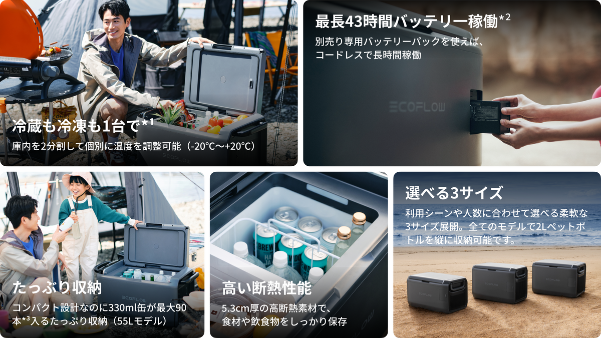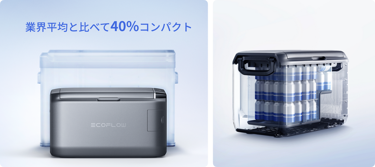 高効率コンプレッサーにより、競合製品と比べて約40%の省エネ化を実現しつつ、強力に冷却。電源がなくても専用バッテリーパックで長時間使用可能です。