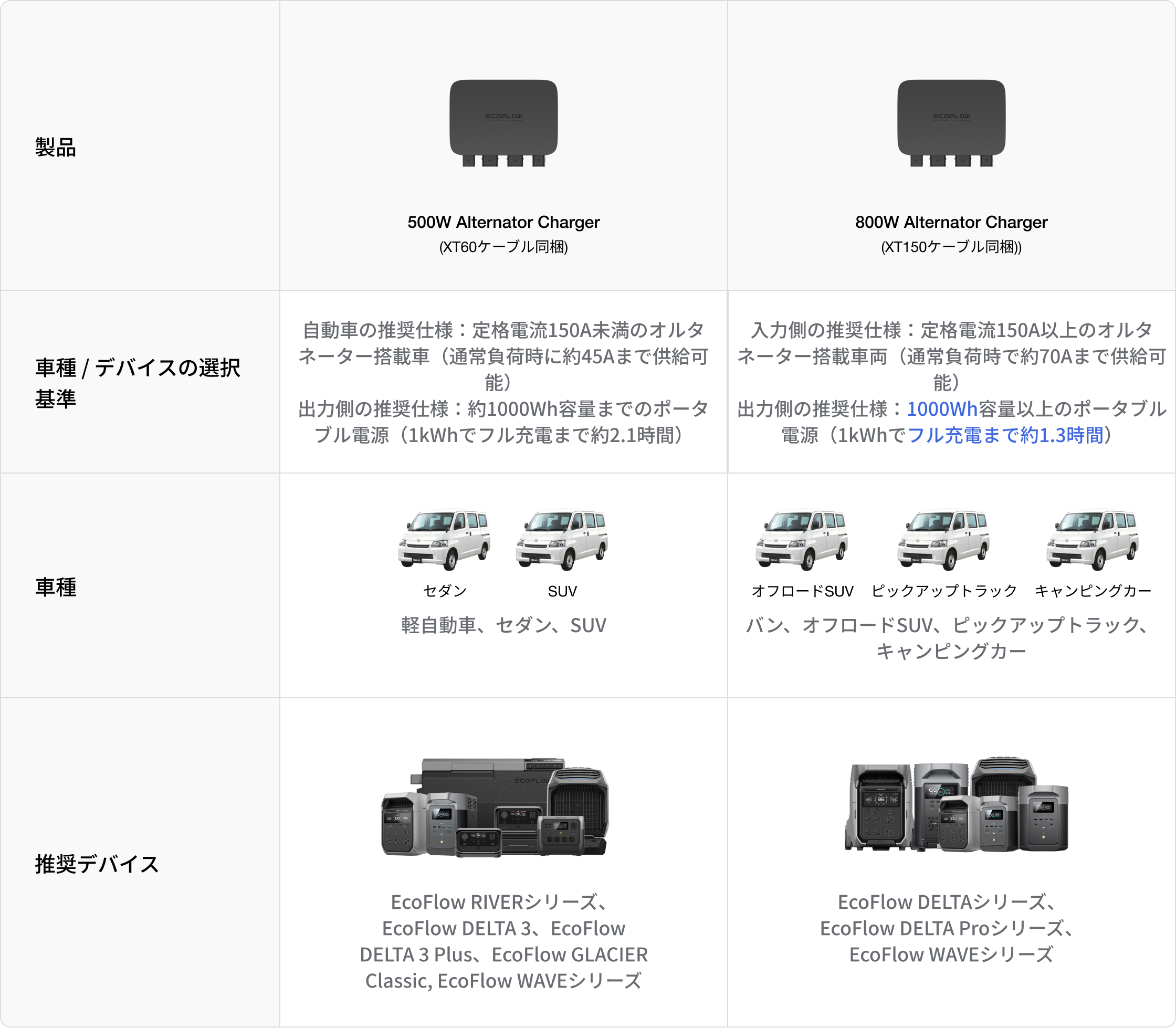 1. 500Wは、最大出力時の値です。オルタネーターの出力電流や動作条件に応じて変動する可能性があります。