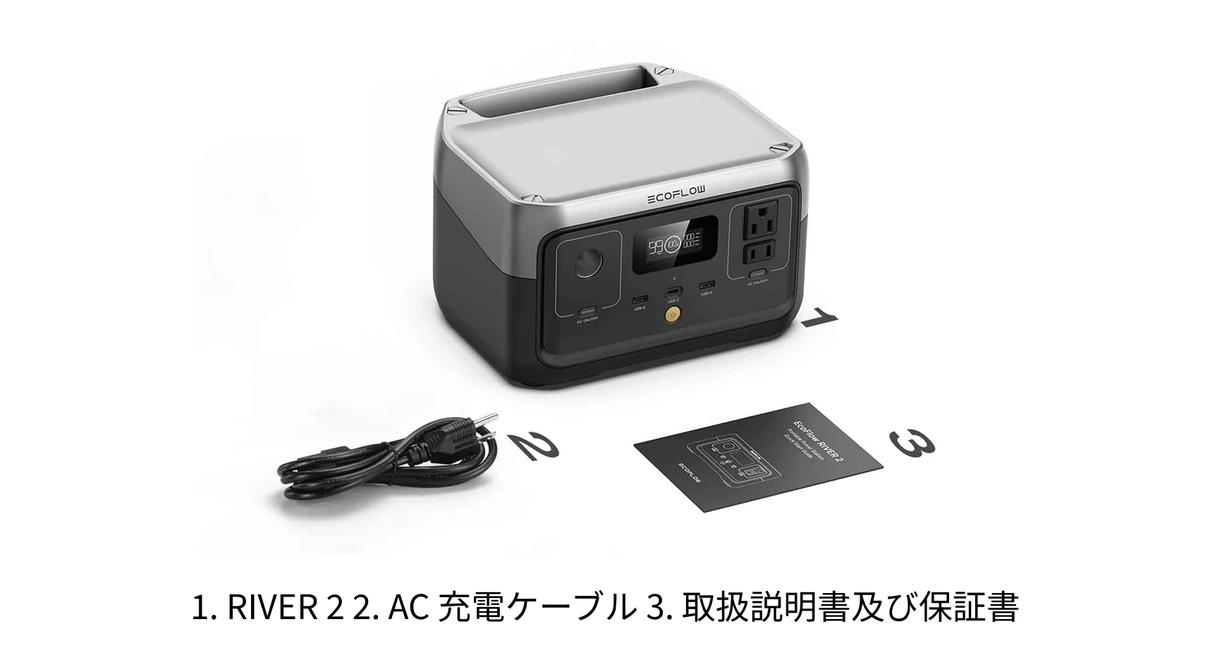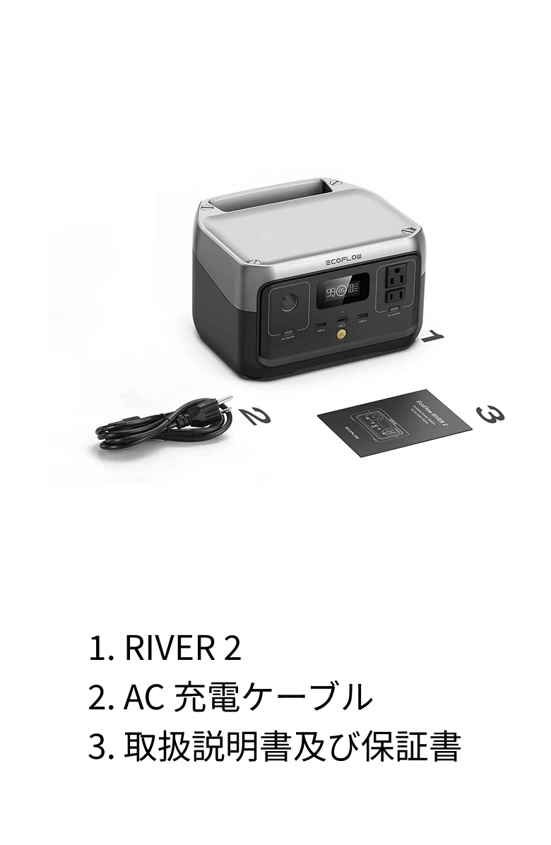 1. RIVER 2 2. AC 充電ケーブル 3. 車載シガーソケット充電ケーブル 4. 取扱説明書及び保証書