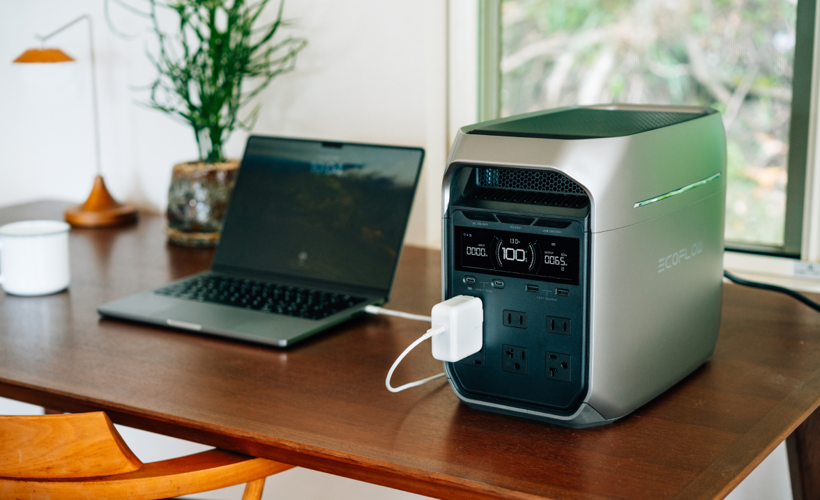 DELTA 3 PlusはACとソーラーパネルとのハイブリッド充電に対応しており、最大入力1,500Wでわずか56分で満充電できます。ハイブリッド充電時には、電気代節約のためにソーラー電力を優先します。