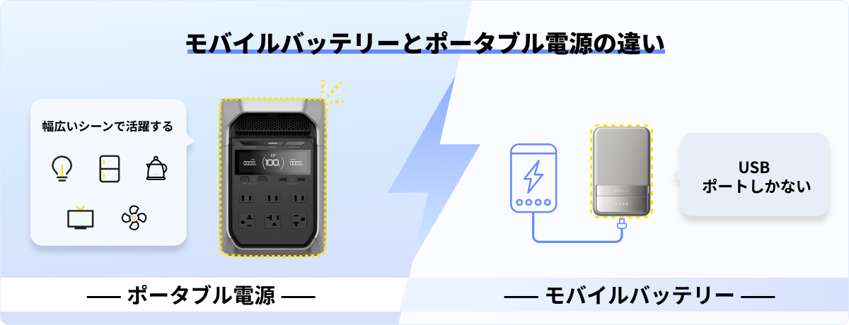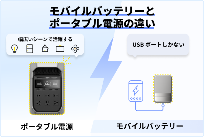 一般的にポータブルバッテリーとは、ポータブル電源を指す言葉です。一方、モバイルバッテリーとは、スマートフォンやタブレットなどを充電できる小型の予備電源を指します。モバイルバッテリーとポータブル電源の主な違いは、出力・容量・出力ポートです。