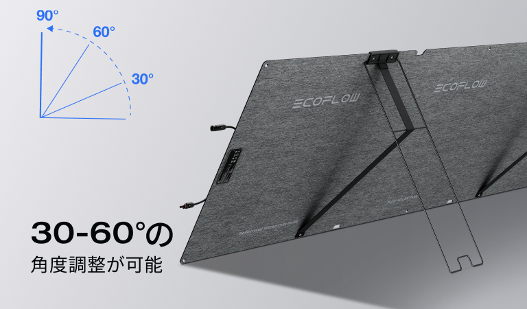 EcoFlow 160W/220W片面ソーラーパネルGen2は、パネル一体型の太陽光角度ガイドとスタンドを備えており、数秒でパネルの設置角度を30°に調整でき、常に最大限の太陽光を得ることが可能です。