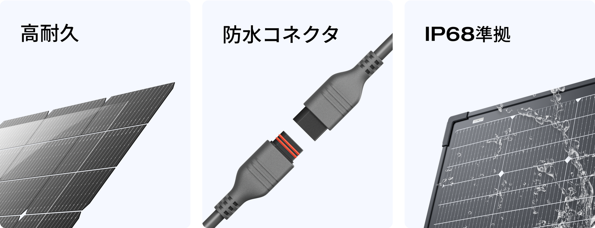 堅牢な耐食性アルミ合金フレームを採用したTOPCon太陽電池は、1.1mmの超薄型強化ガラスによる優れた光透過性、POEフィルムによるUV耐性および耐湿性、PETバックシートによる高い耐久性が特徴です。ソーラーパネル、XT60-WコネクターともにIP68防塵・防水規格に準拠し、