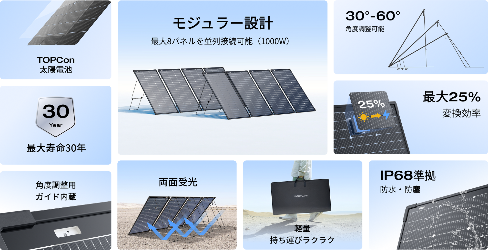 拡張性の向上: さまざまなEcoFlowポータブル電源と互換性があり、使用するパネル数を調整することで、簡単に電力を増やせます。また、古いパネルと新しいパネルを合わせて使用しても全体出力に影響がなく、最大効率で使用可能です。