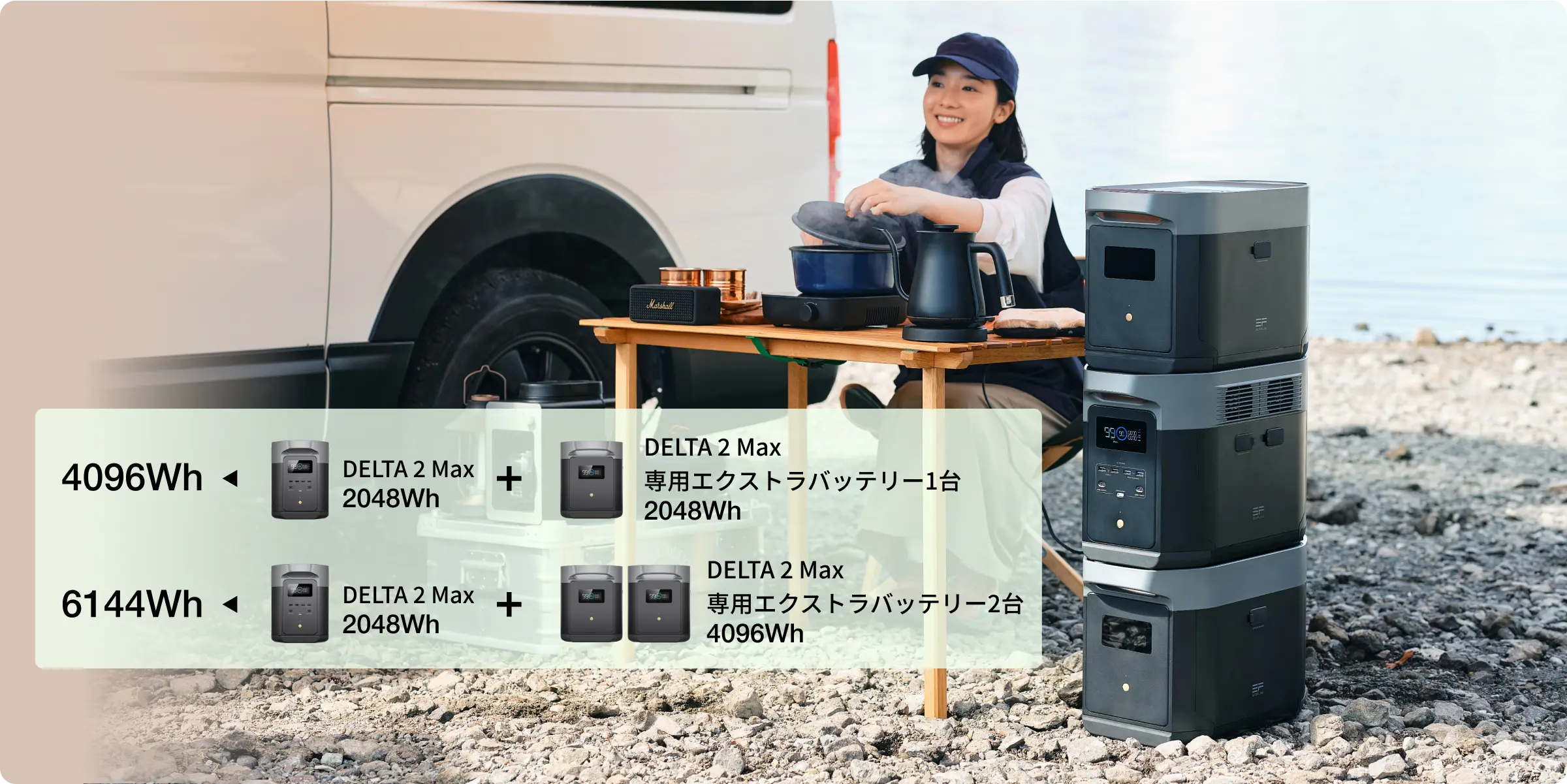 DELTA 2 Maxは、1台で約2日間の遠出にピッタリな2kWhの大容量。人数や期間、利用シーンに合わせてエクストラバッテリーを使用することで、