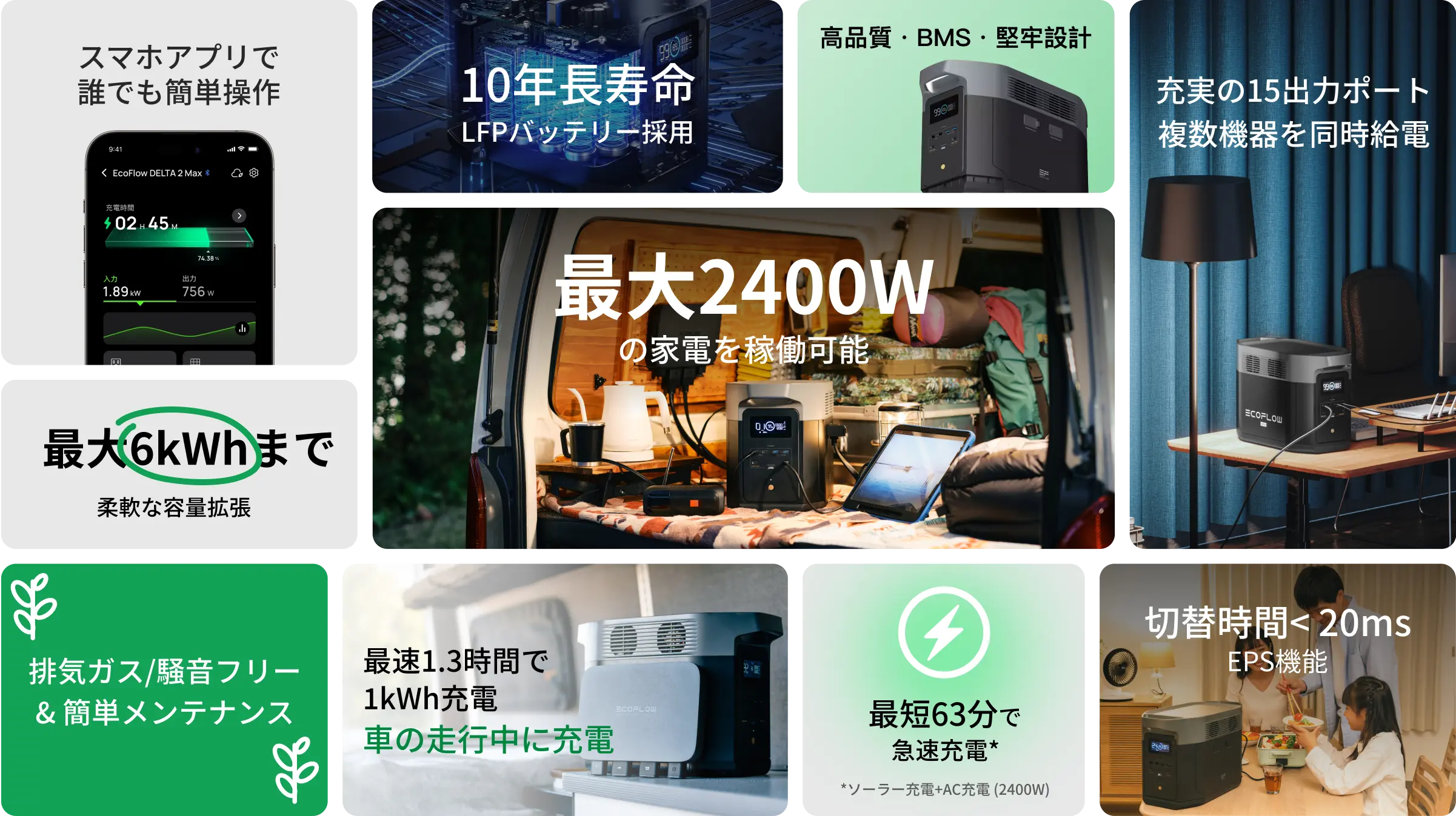 最大6144Whの大容量で十分な電力を確保します。大人数や長期間の車中泊はもちろん、防災・停電時の家庭用バックアップとしても活躍し、
