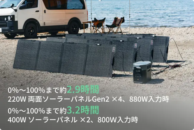 最大6144Whの大容量で十分な電力を確保します。大人数や長期間の車中泊はもちろん、防災・停電時の家庭用バックアップとしても活躍し、