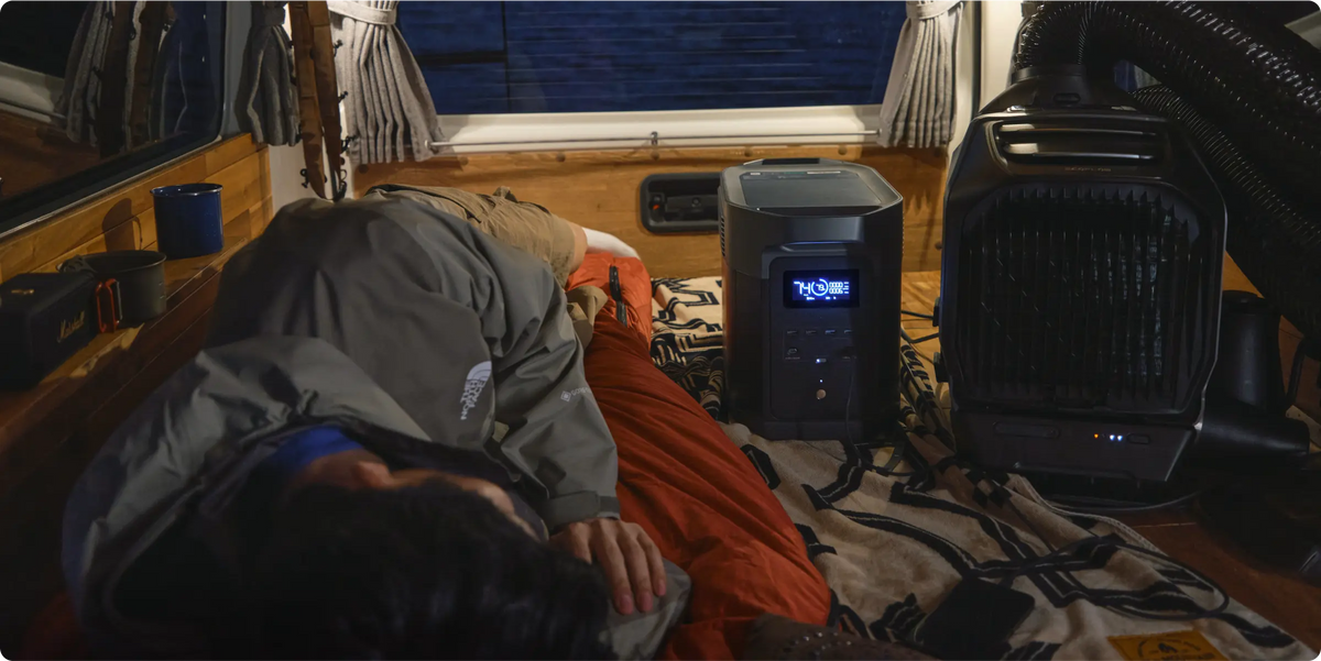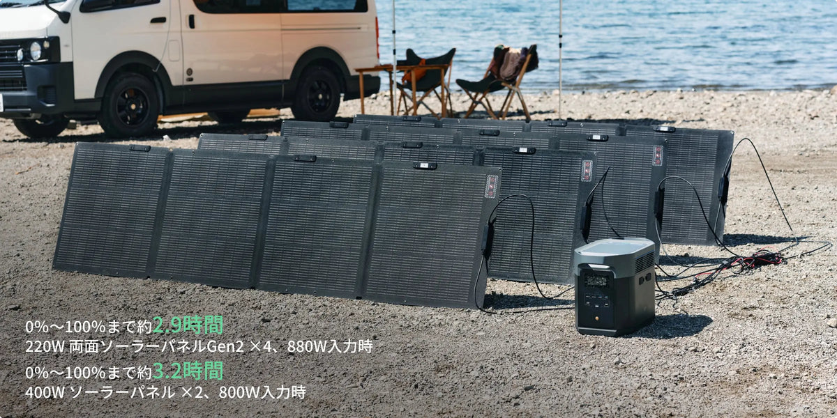 DELTA 2 Maxは、1台で約2日間の遠出にピッタリな2kWhの大容量。人数や期間、利用シーンに合わせてエクストラバッテリーを使用することで、