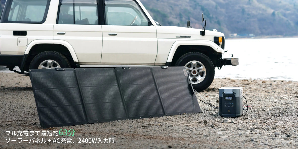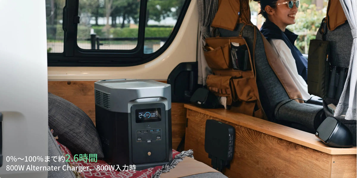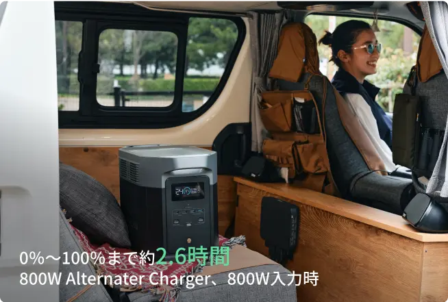 DELTA 2 Maxは、これまでにない急速走行充電を実現するEcoFlow 800W Alternator Chargerに対応しています。従来のシガーソケットに比べて約8倍の急速走行充電ができるため、お出かけ前の充電忘れも心配ありません。自動車の走行中やアイドリング中に発生する余剰電力で充電するため、移動時間で効率的に充電できるだけでなく、お得に充電が可能です。