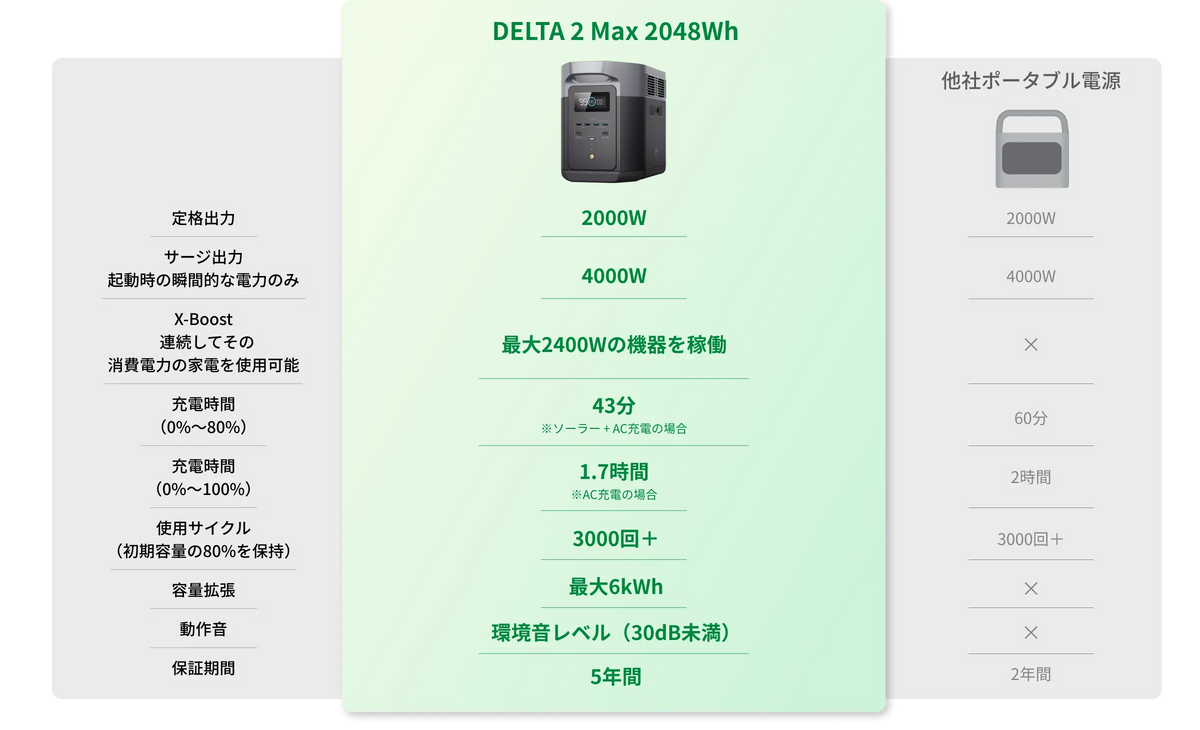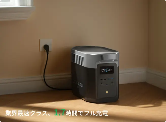大容量のDELTA 2 Maxは、災害時の電力供給にも活躍。高品質LFPバッテリーにより、約3000サイクル使用しても初期容量の80%を維持する