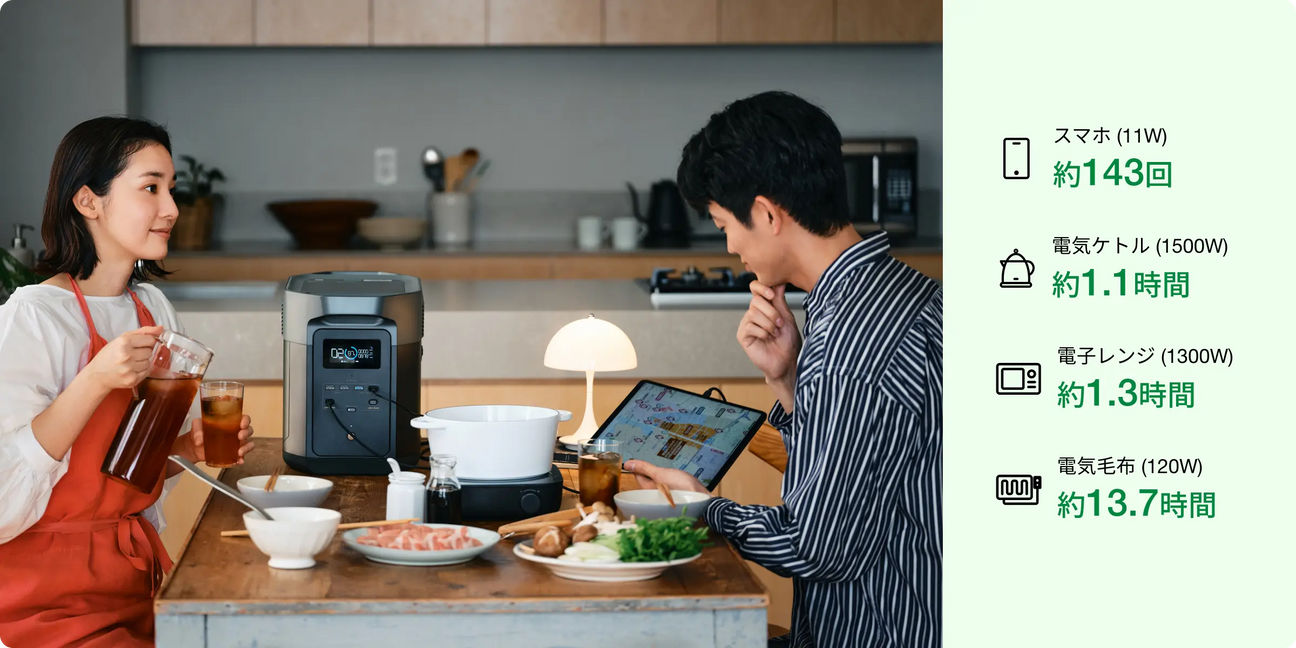 IHクッキングヒーターや電子レンジなどの調理器具も使えるので、もっと楽しく快適な車中泊へ。電動工具や高出力機器を含む99%の電化