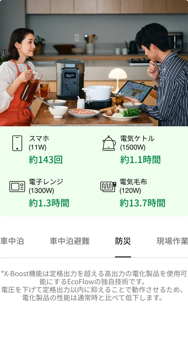 DELTA 2 Maxは、定格2000W出力で幅広い電化製品に対応します。独自のX-Boost機能*により、最大2400Wの家電も稼働可能です。