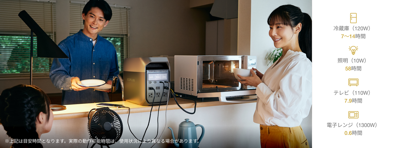 DELTA 3シリーズは、1500Wの高出力で冷蔵庫やオーブンなど99%の電化製品に電力を供給可能です。