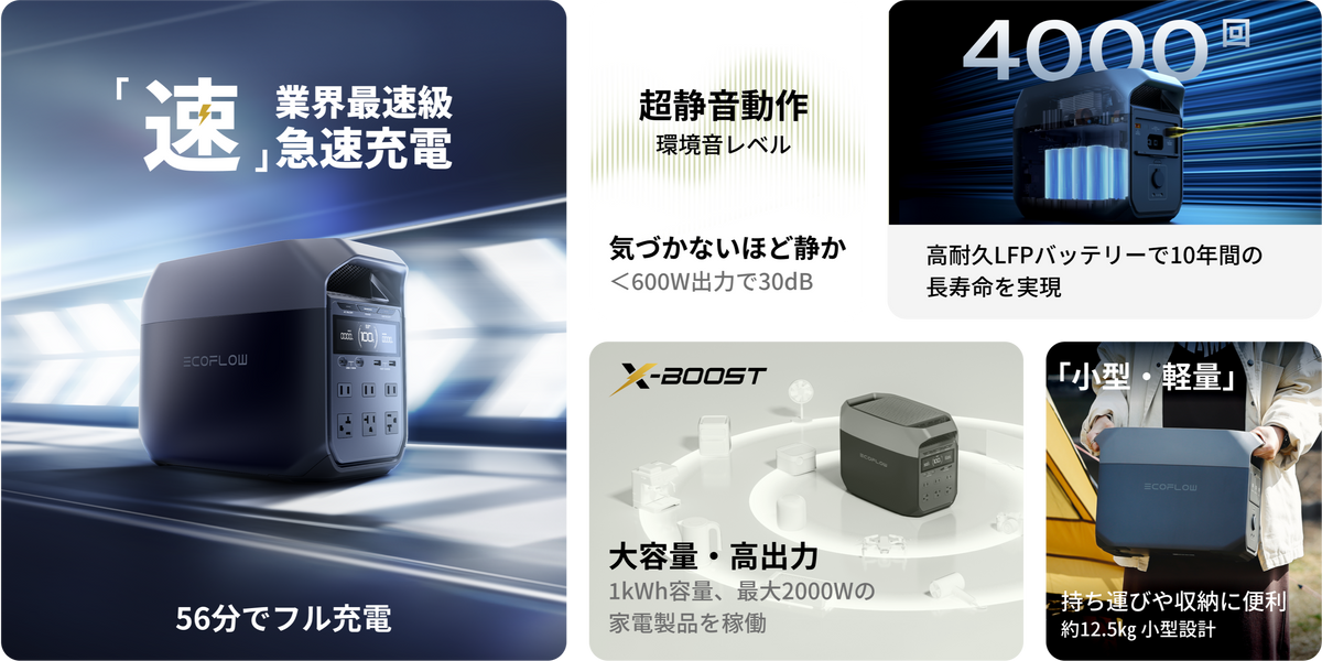 * X-Boost機能は、定格出力を超える高出力の電化製品を使用可能にするEcoFlowの独自技術です。電圧を下げて定格出力以内に抑えることで動作させるため、電化製品の性能は通常時と比べて低下します。接続機器によっては、使用できない場合もあるためご注意ください。また、ポータブル電源がAC電源で充電されている間(パススルーモード時など)は使用できません。