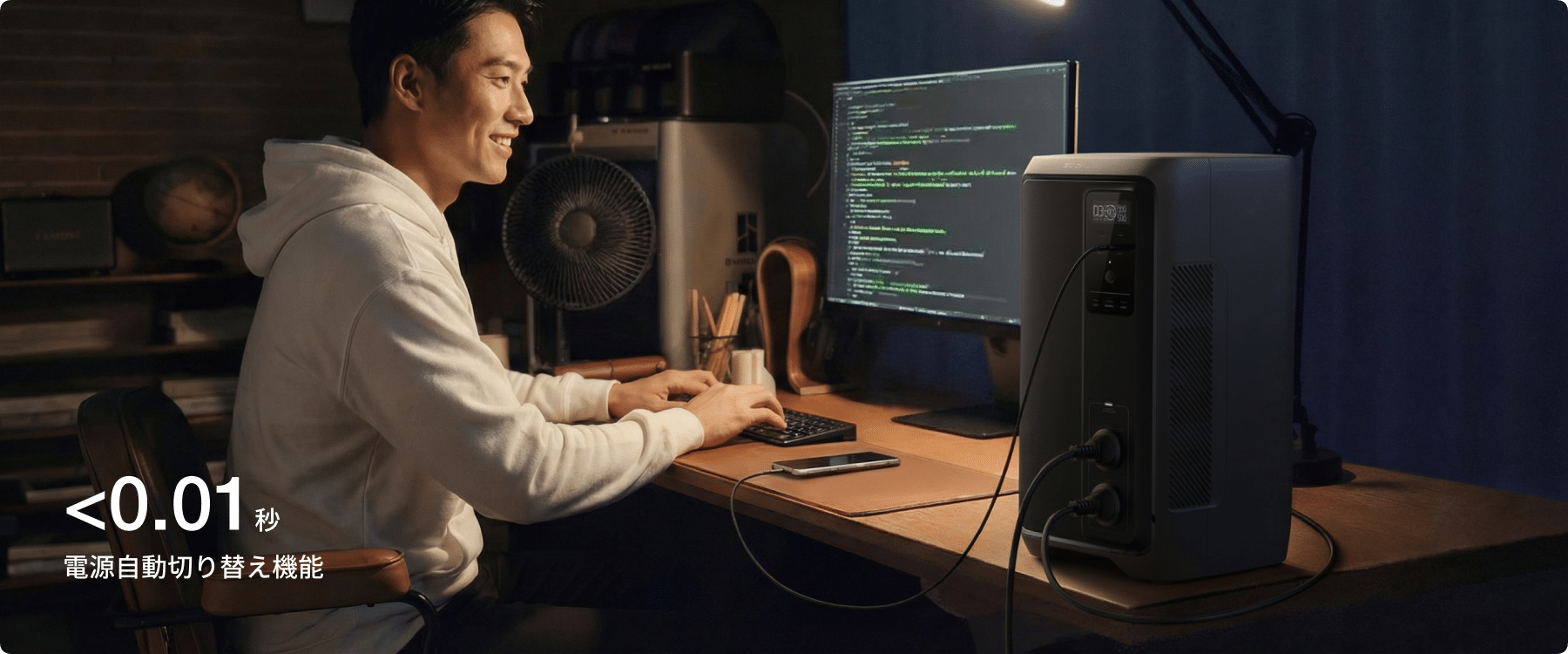停電時、接続機器の電源を商用電源からDELTA 3 2000 Airに0.01秒未満で即座に切り替え*。冷蔵庫やPCなど、継続的な給電が重要な電化製品を突然の停電から守ります。