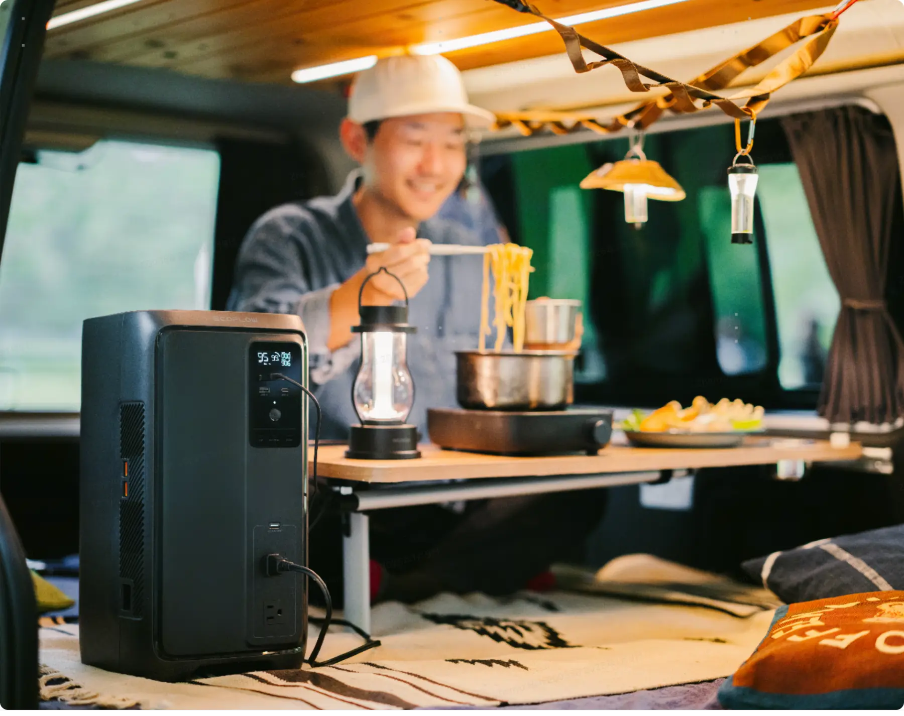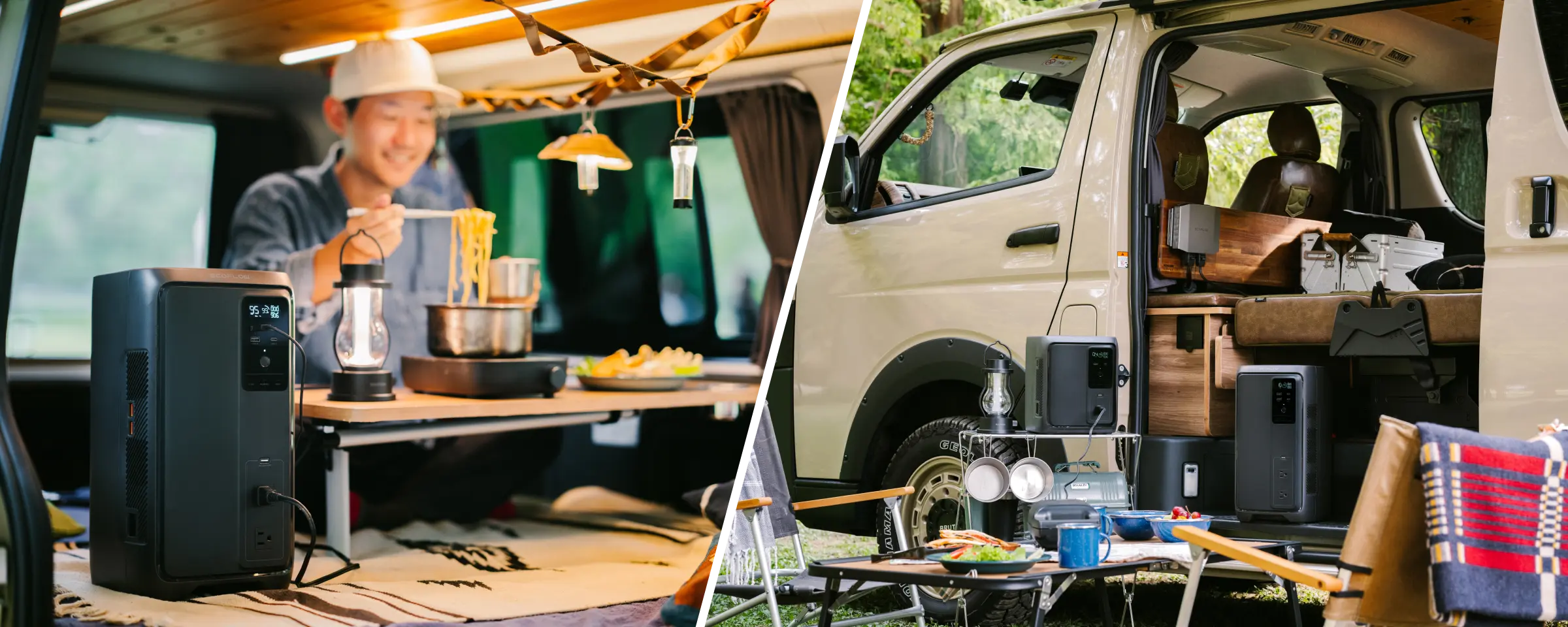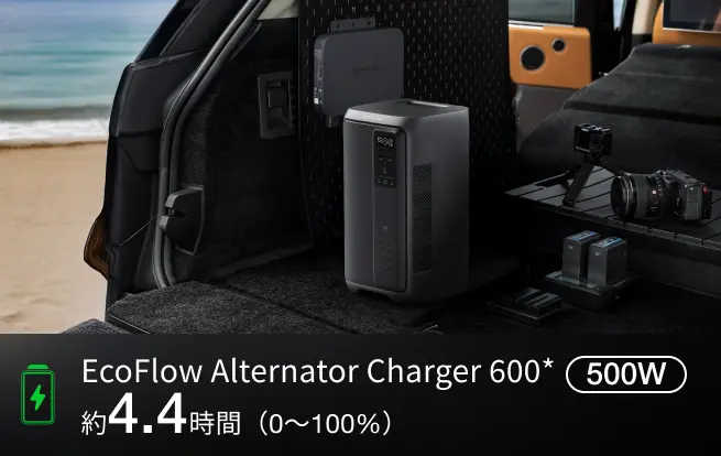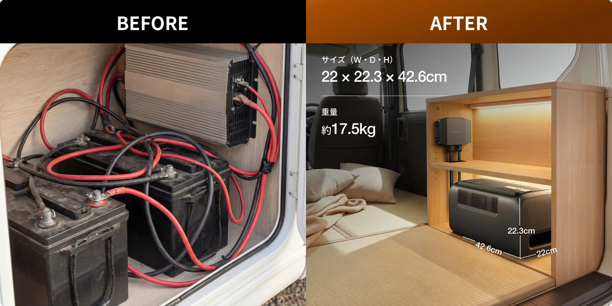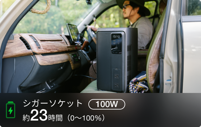面倒な配線や施工の手間を解消。走行充電器との連携で、車載電源を最小限のスペースに集約。車内を広く使えるのはもちろん、ポータブル電源として自由に持ち出すことも可能です。