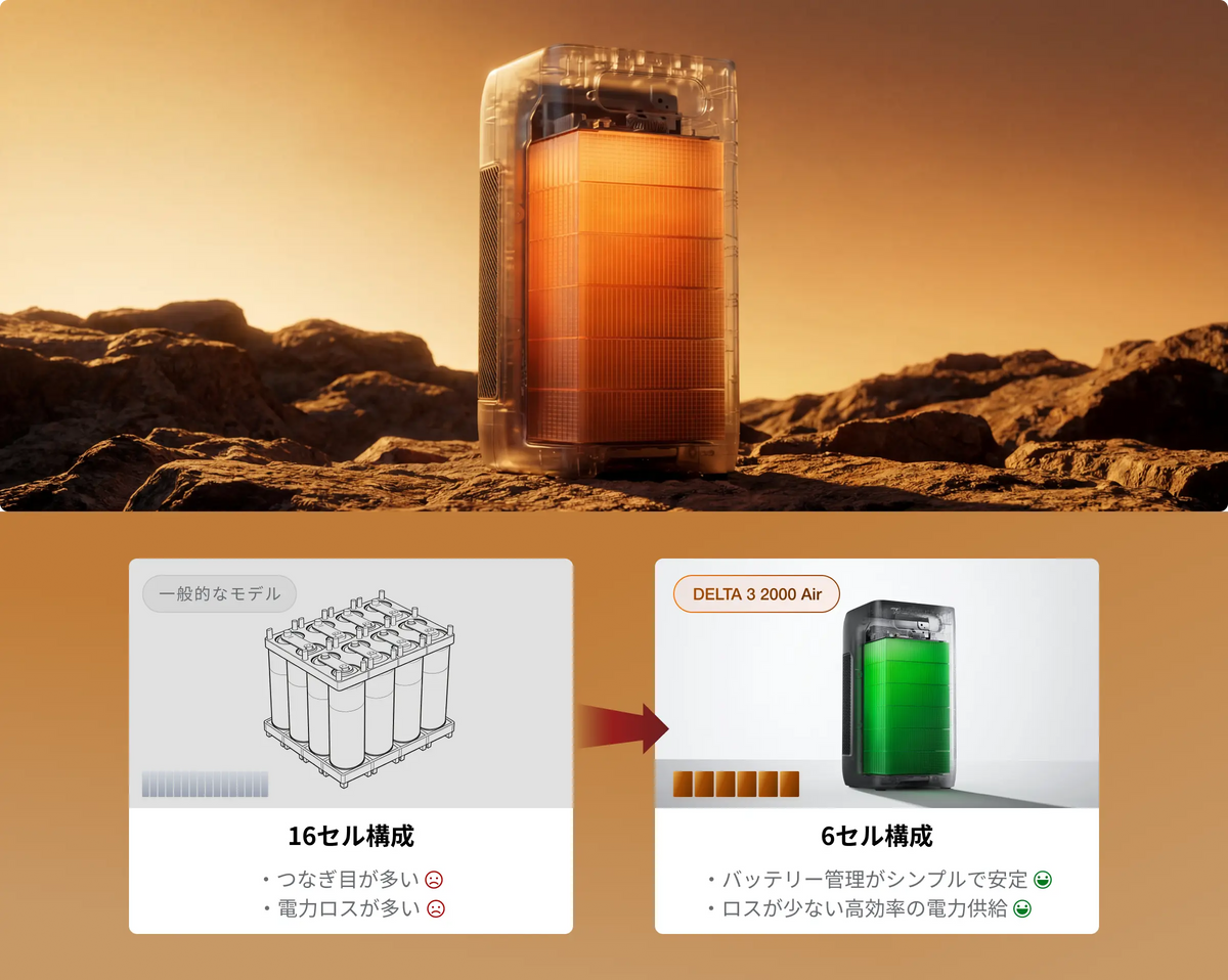 「16セル」から「6セル」へ。接続箇所を最小限に抑えることで電力ロスを低減し、エネルギー効率を最大化しました。