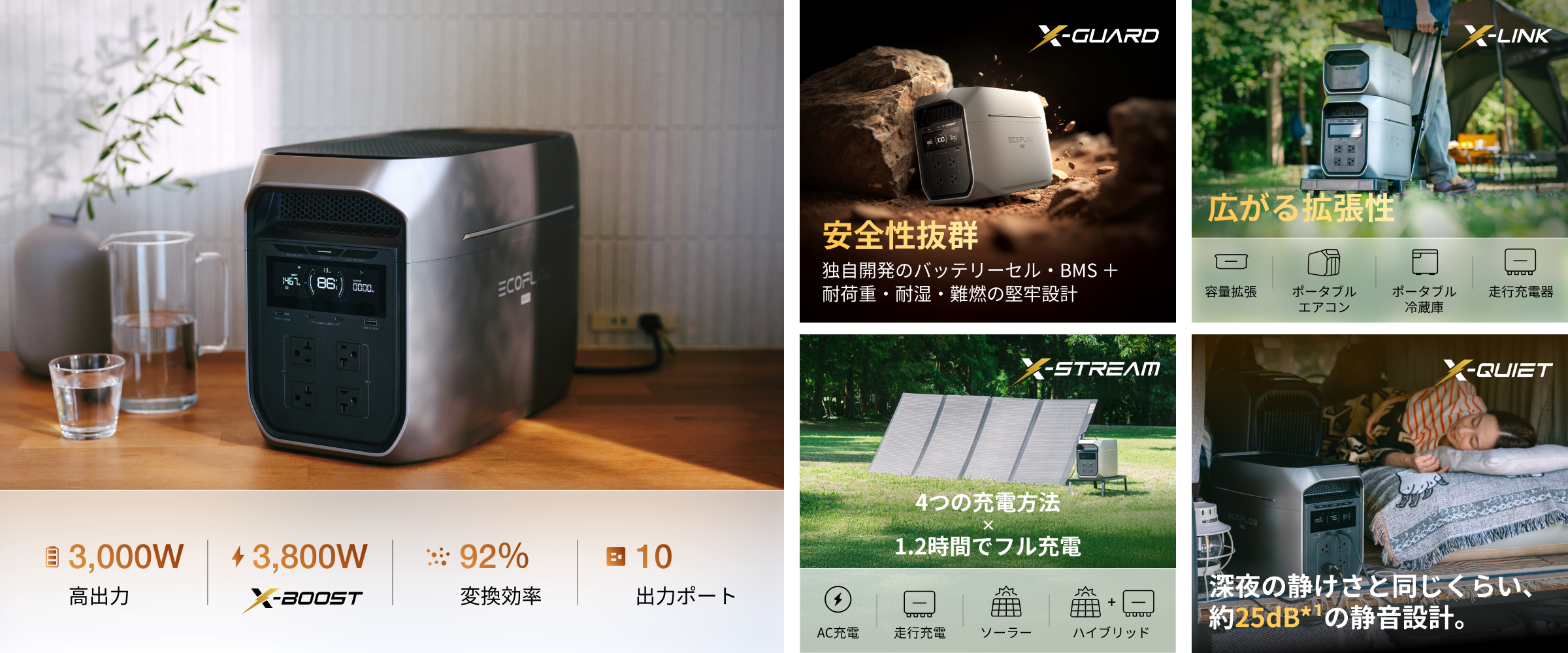 *⁴ 車両用バッテリーへの補充電には、EcoFlow Alternator Charger本体と専用ケーブル(500W/800W用、600W/1000W用)が別途必要となります。