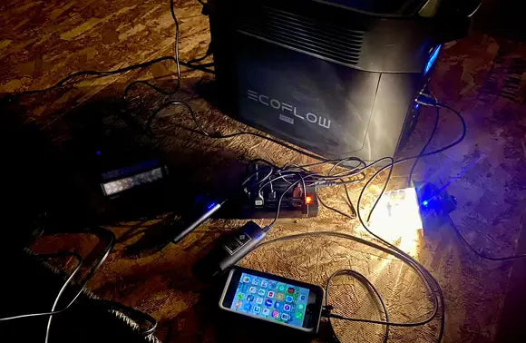 珠洲市の避難所で、ポータブル電源を活用し、複数の照明やスマホを同時に充電。大容量と多ポート設計により、避難所の人々に安心と便利を提供します。