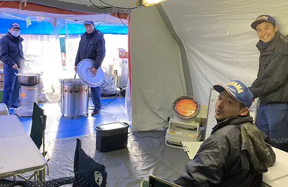 災害時、富山消防局の消防士たちが救援活動に全力を尽くしています。高出力のポータブル電源でヒーターを稼働させ、非常時でも暖かさと安心を届けます。