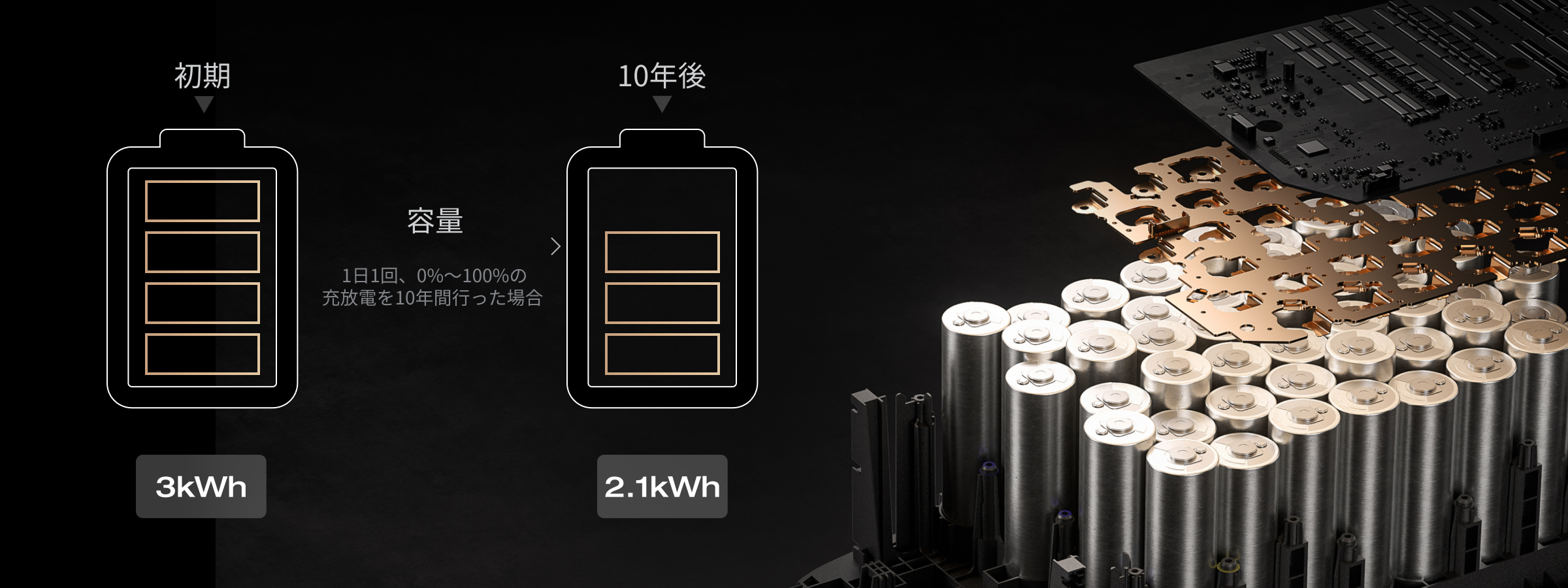 発熱を抑えて効率よく電力を出力できるので、長時間使っても安心。10年経っても約70%以上の容量を維持する長寿命で買い替えの心配がぐっと減り、