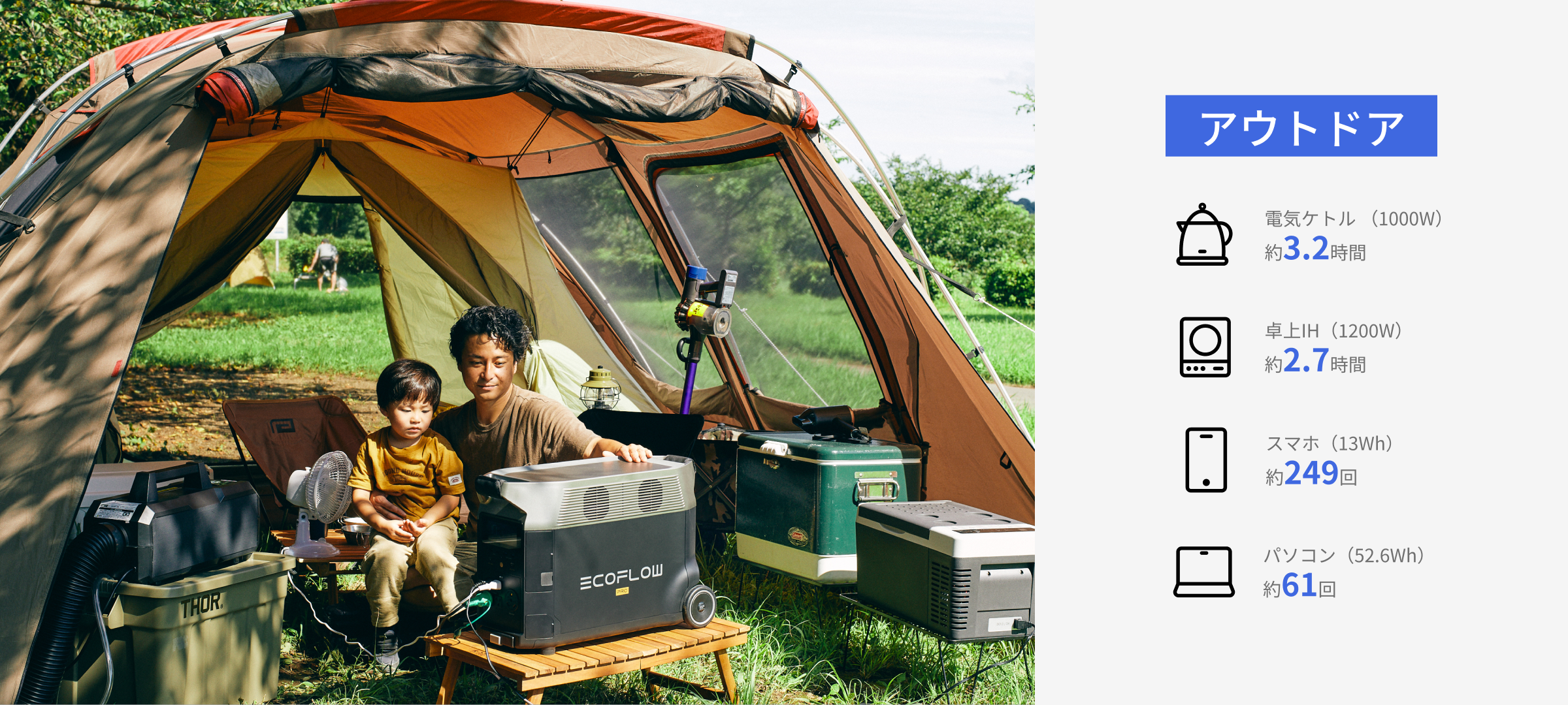 キャンプや車中泊などのアウトドアシーンはもちろん、日常使いや災害時のバックアップ電源としても大活躍。