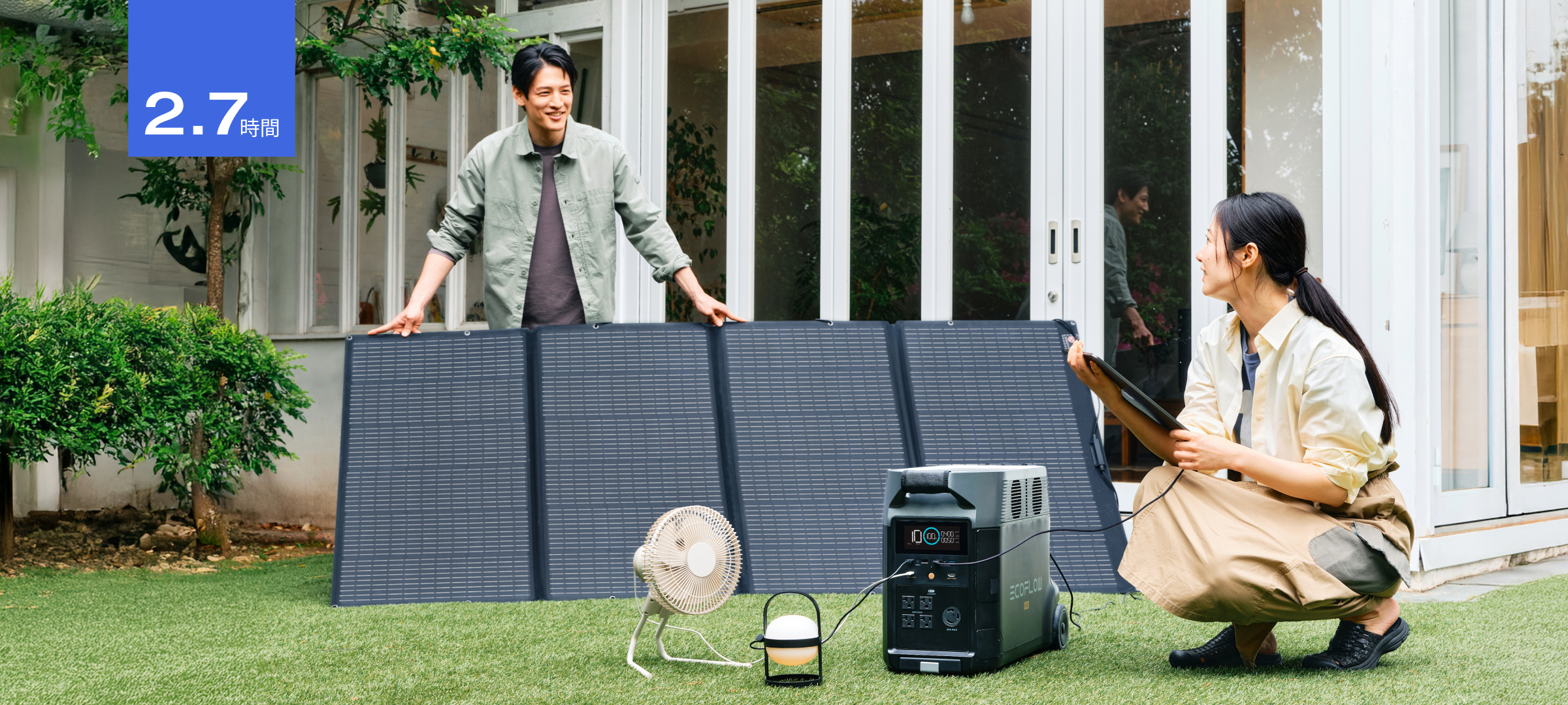1600Wのソーラーで充電した場合、約2.7時間で0%から100%まで充電が可能です。