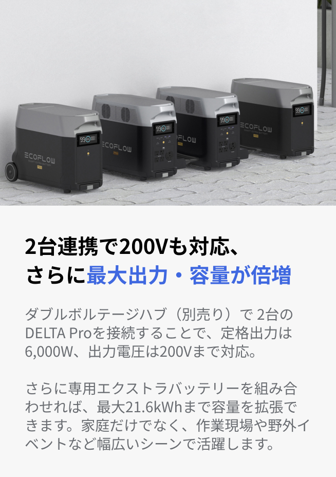 ダブルボルテージハブ(別売り)で 2台のDELTA Proを接続することで、定格出力は6,000W、出力電圧は200Vまで対応。