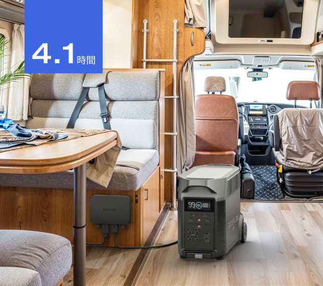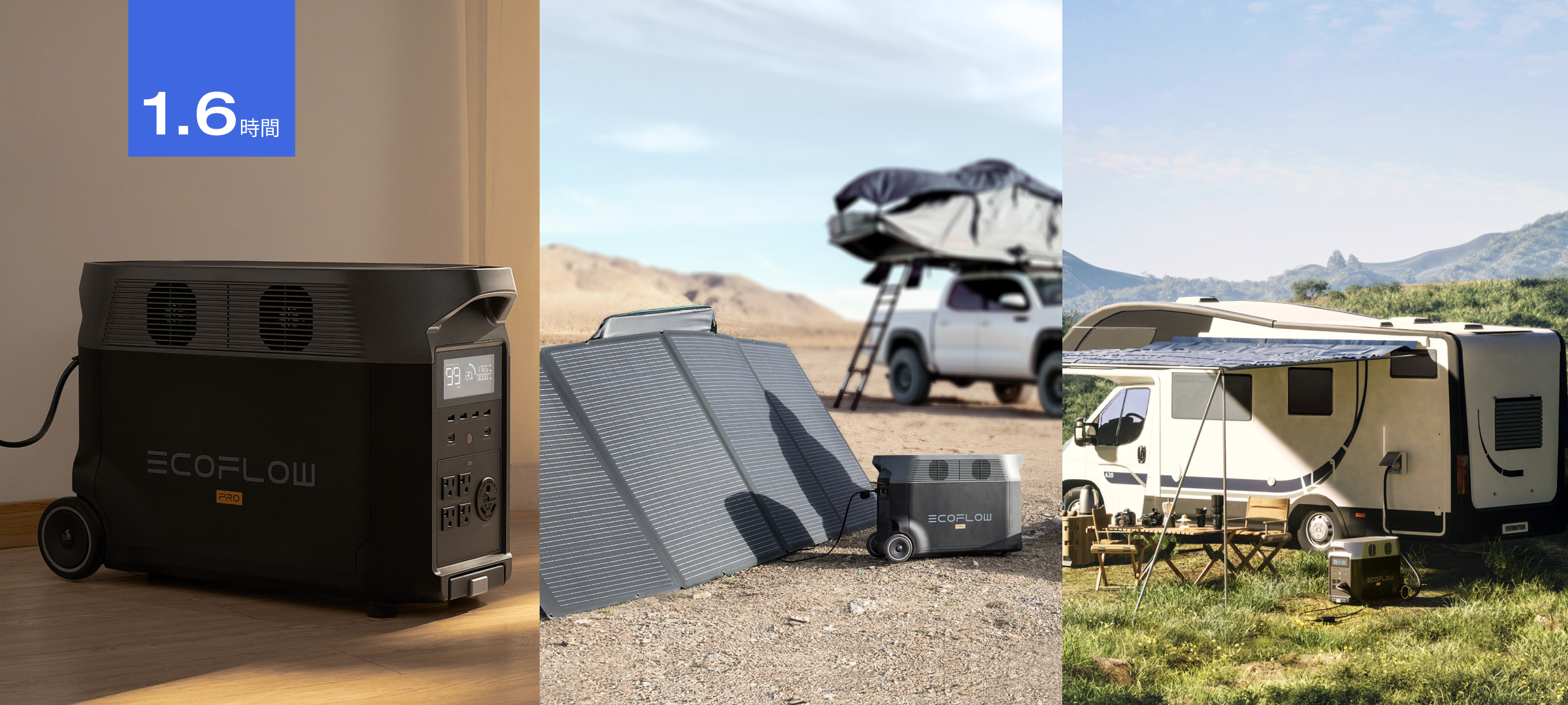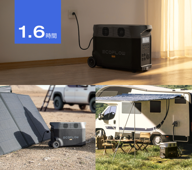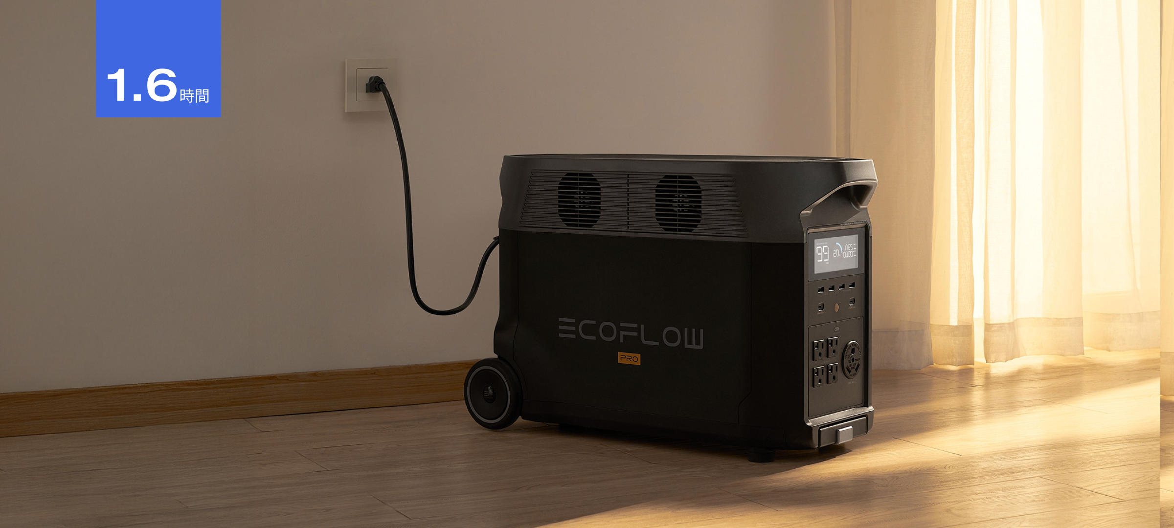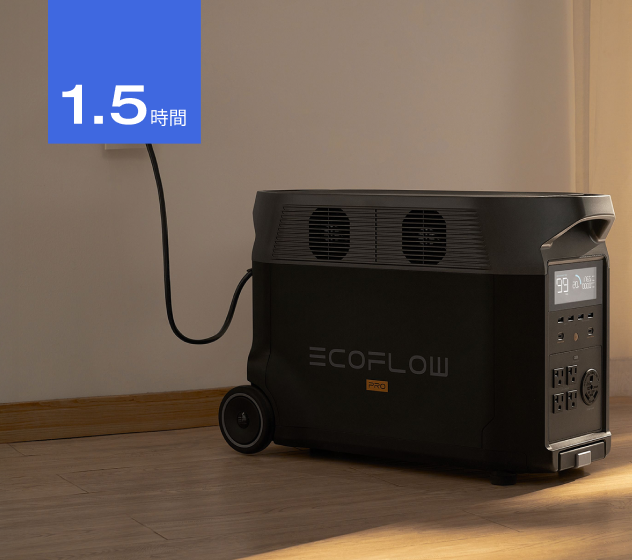ACコンセントを使ってDELTA Proを充電する場合、200V電源を使用すれば、バッテリー残量が20%から100%まで約1.5時間で充電できます。一方、100V電源を使用した場合、同じ条件で約2.3時間でフル充電できます。