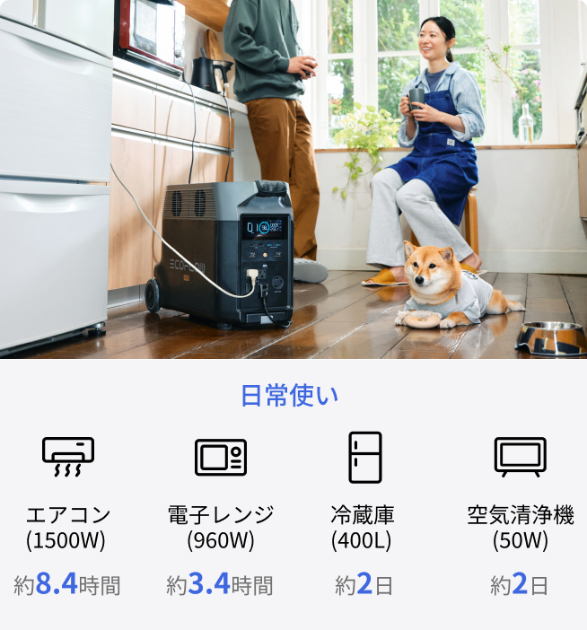 *1 機器の動作時間は、各製品のカタログ値などを基に算出した参考値です。実際の動作時間は、各機器の仕様や使用環境により異なります。また、すべての機器を同時に使用できるわけではありません。ご自宅の停電状況や使用機器の優先度に応じて、必要な機器を選択してご使用ください。複数機器を同時に使用する場合、各機器の消費電力の合計が定格出力を超える場合は同時に使用できません。また、医療機器、生物や生体組織の飼育・培養・保管機器、医薬品類の保管用冷蔵庫など、電源が途絶えると生命・財産に重大な損害を及ぼす恐れのある機器には使用しないでください。
