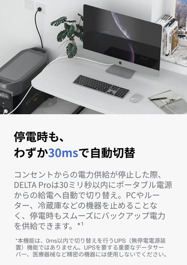 *本機能は、0ms以内で切り替えを行うUPS(無停電電源装置)機能ではありません。UPSを要する重要なデータサーバー、医療器械など精密の機器には使用しないでください。
