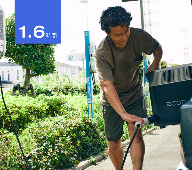 ACコンセント、ソーラーパネル、EVチャージャーの3つを同時に使用し、最大6,500Wで充電すれば、バッテリー残量がゼロの状態からでも、約1時間40分で満充電できます。