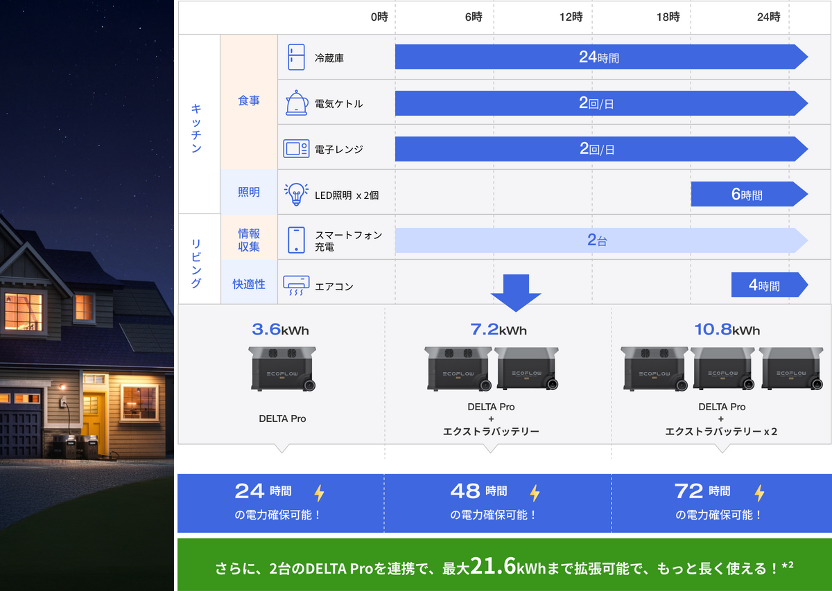 DELTA Proは停電·災害時にあなたの暮らしを守る「ライフライン」です。生活家電からエアコン·IH·電気給湯器まで給電可能。ダブルボルテージハブ(別売り)で2台のDELTA Proを連結することで200Vに対応、定格出力は2倍の6,000Wに。さらに、最大21.6kWhまで容量を拡張できます。家庭用はもちろん、企業や公共施設向けの防災システムとしても運用できます。