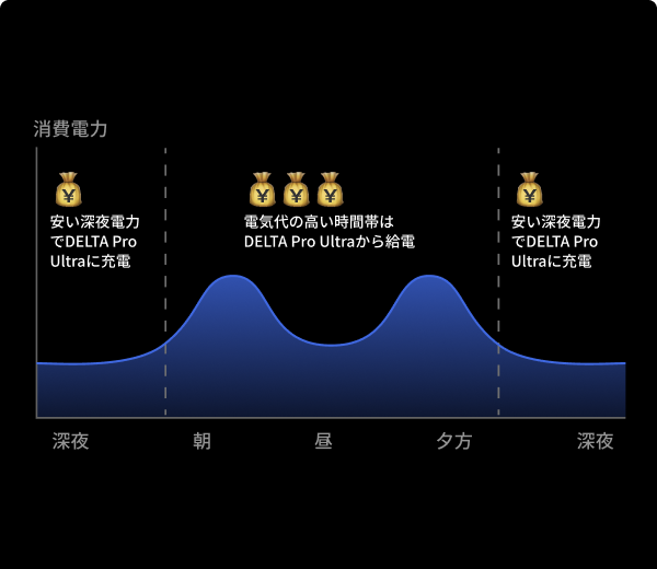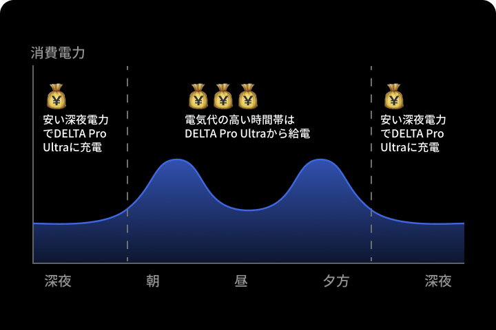 既存の太陽光発電システムや商用電源からの電力をDELTA Pro Ultraに蓄電しながら、電化製品へ電力を供給します。また、電源切替盤により普段はDELTA Pro Ultraから電化製品などへ優先的に給電します。DELTA Pro Ultraの出力が無い場合、電源切替盤が電化製品への給電を商用電源に自動で切り替えます。