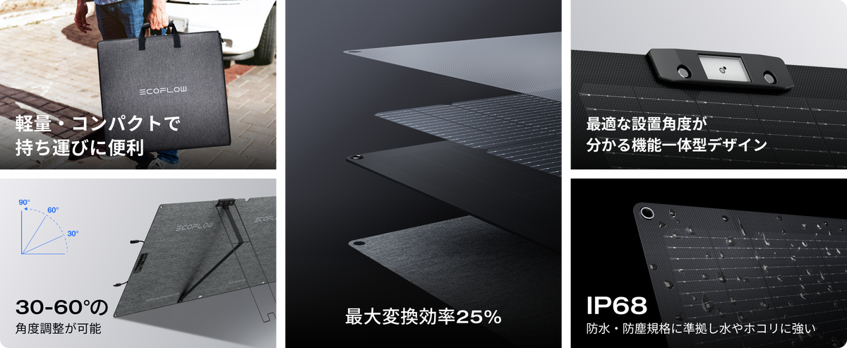 IP68防⽔・防塵規格に準拠した160W片面ソーラーパネル Gen2は、雨をはじめとする厳しい気象条件下でも高性能を維持します。また、防塵性能にも優れています。