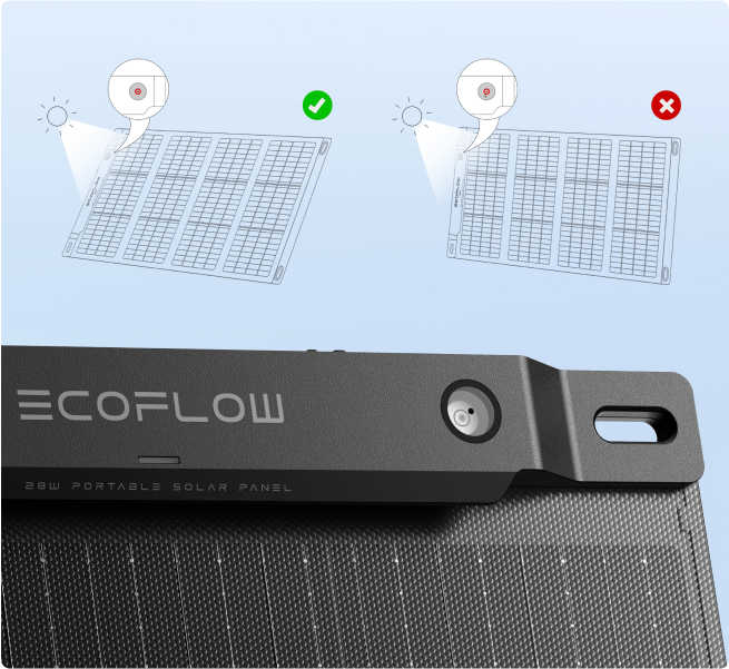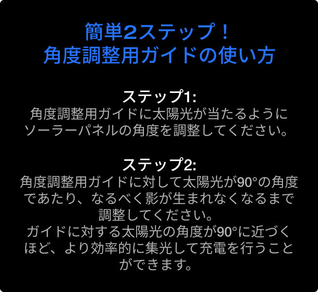 充電効率を高めるため、ソーラーパネルは太陽光が正面から当たるように角度と向きを調整してください。