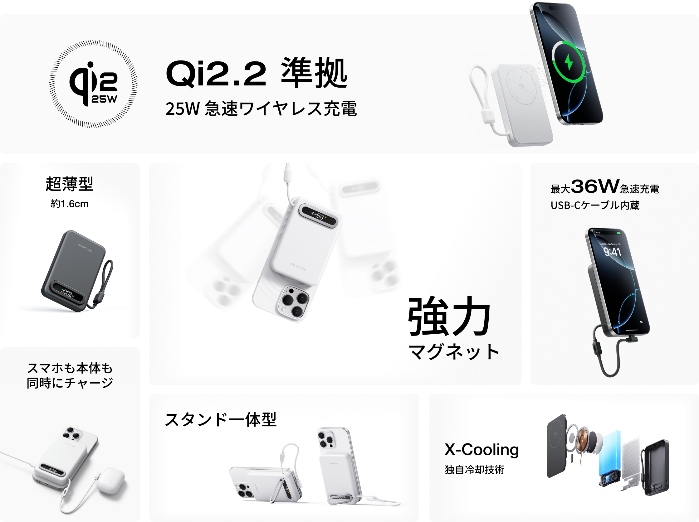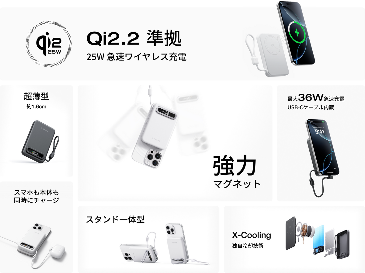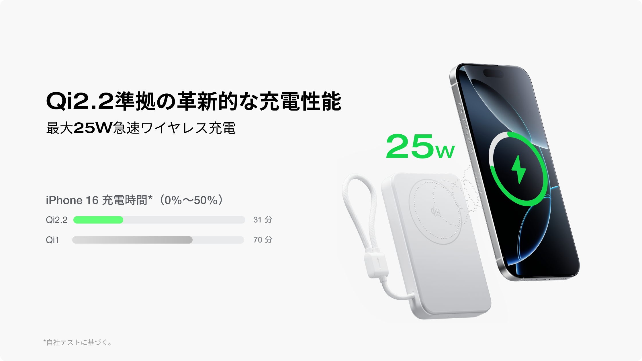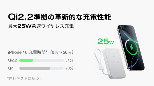 Qi2.2ワイヤレス充電規格に準拠し、最大25Wの超急速ワイヤレス充電が可能です。最大7.5WのQi1規格に比べて3倍の充電速度を実現し、USB-Cケーブルによる急速充電に劣らないスピードで最新iPhoneを安全に充電できます。