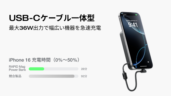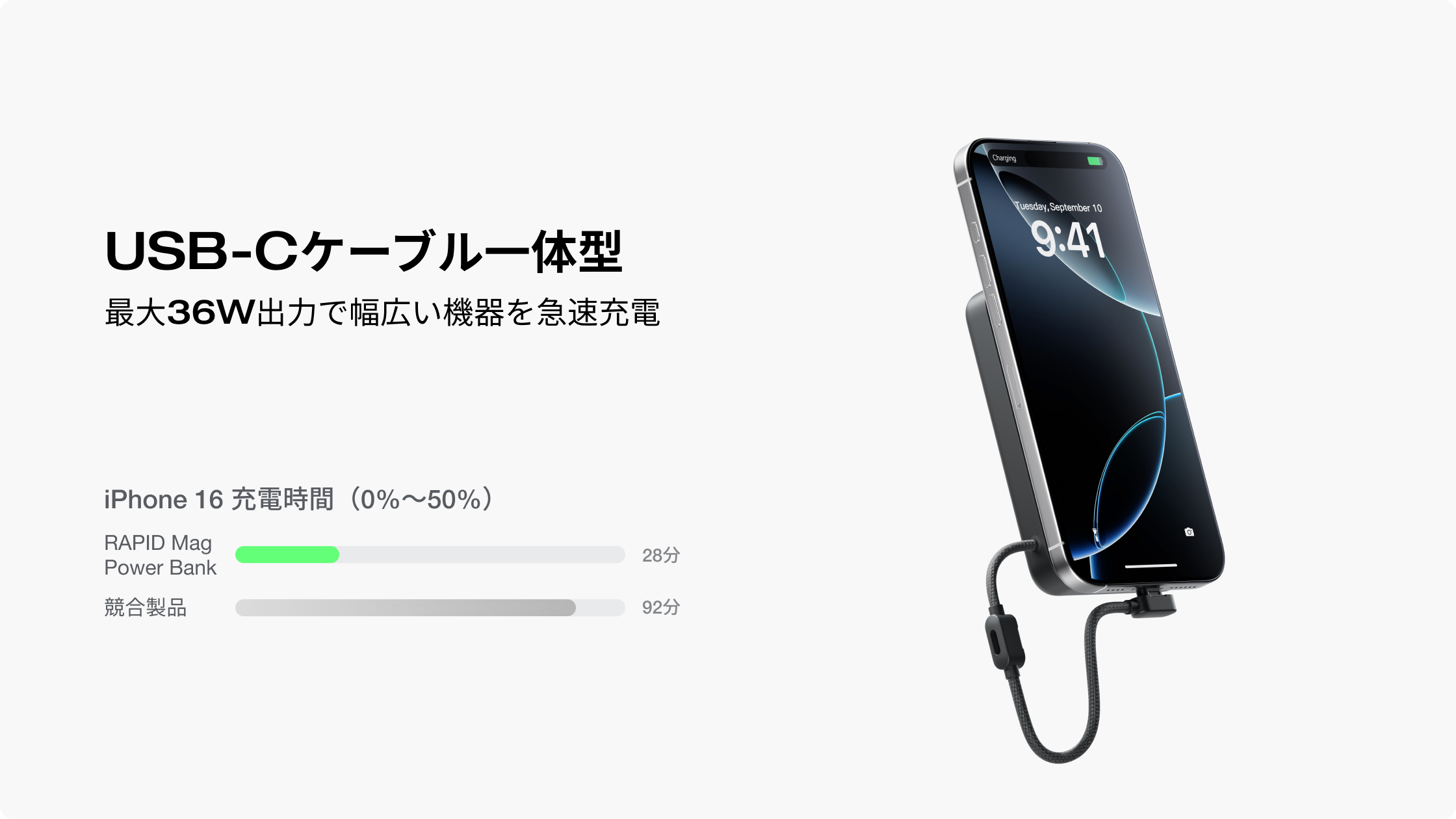 ストラップ式のUSB-CケープルとUSB-Cポートを1つずつ搭載し、幅広い機器を最大36W出力で急速充電。