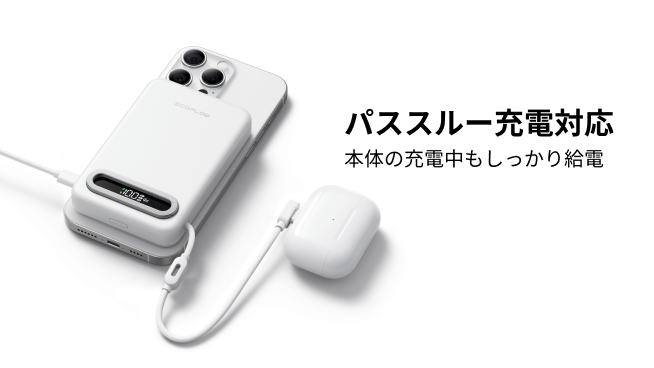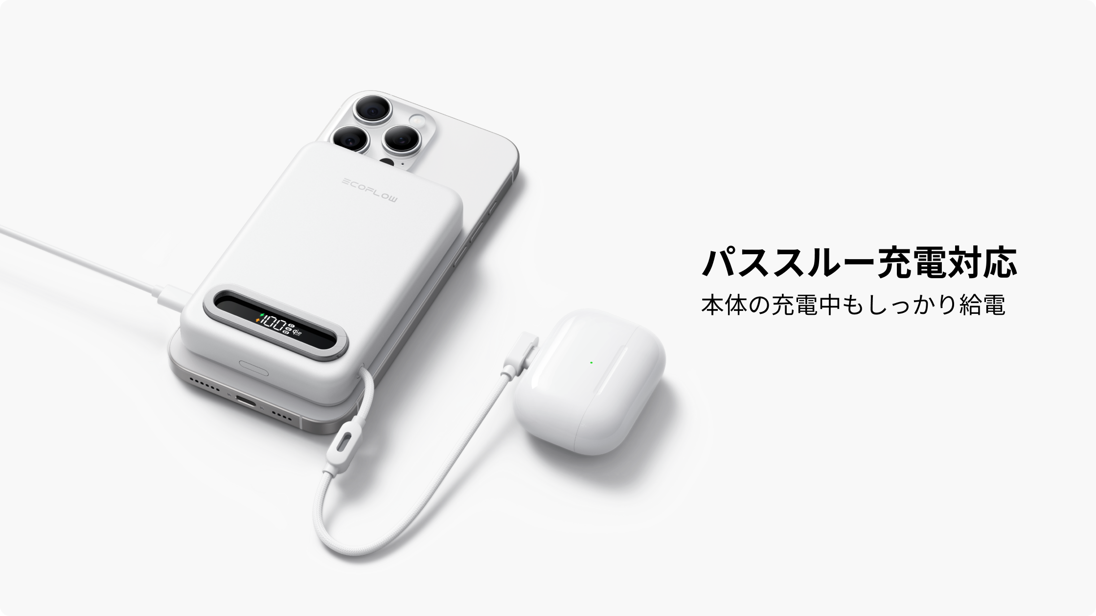 いずれも可能です。本体充電中に最大25W出力のワイヤレス充電を行うためには、30W以上の出力に対応したACアダプターおよびUSB-Cが必要です。また、USB-C経由でデバイスを充電している場合、デフォルト設定ではワイヤレス充電がオフになります。同時に使用したい場合は、本体のボタンを3秒間長押ししてください。