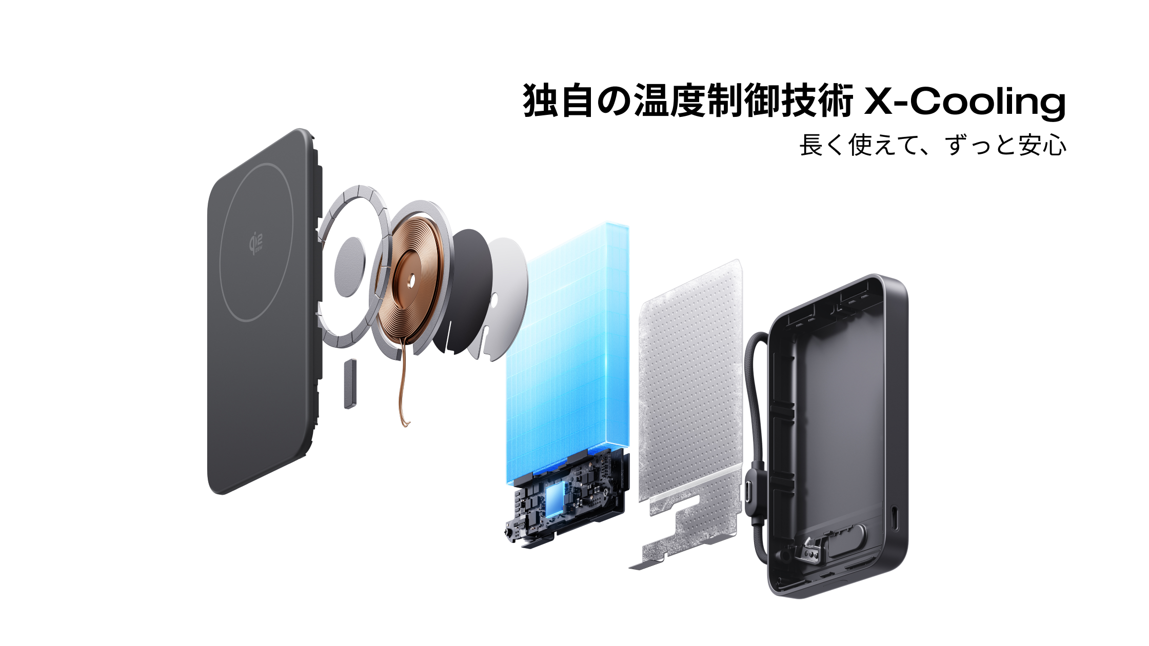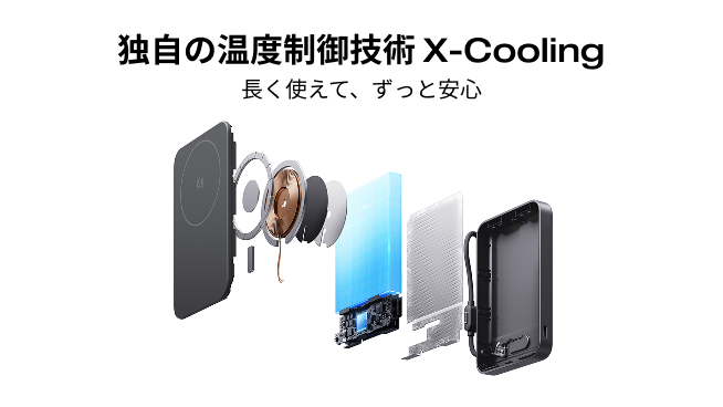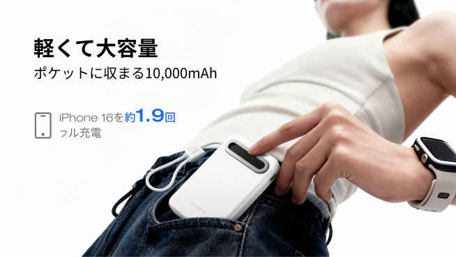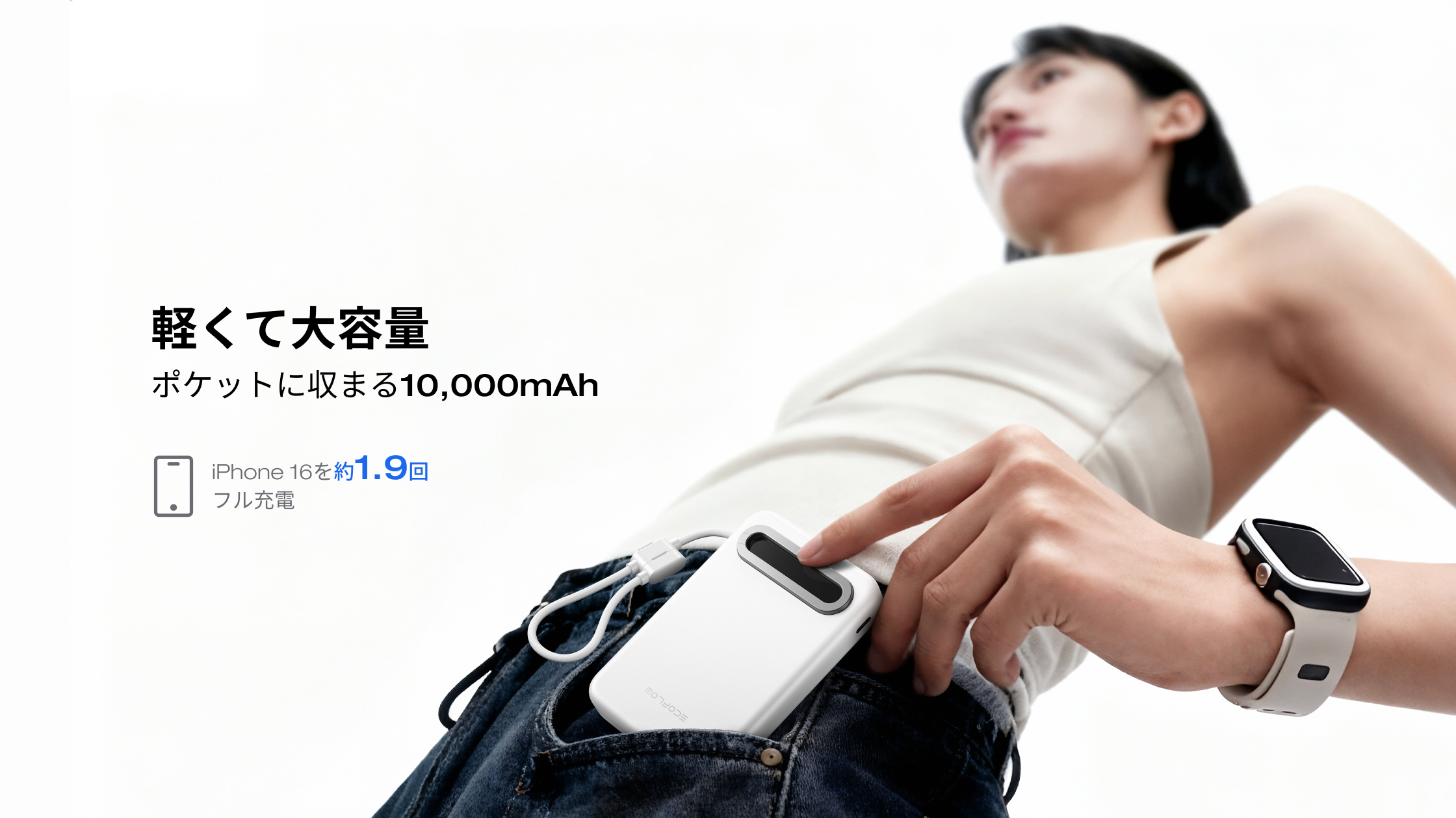 iPhoneグレードの高密度コバルト酸リチウムバッテリーを採用し、わずか約230gの軽量ボディに10,000mAhの大容量。