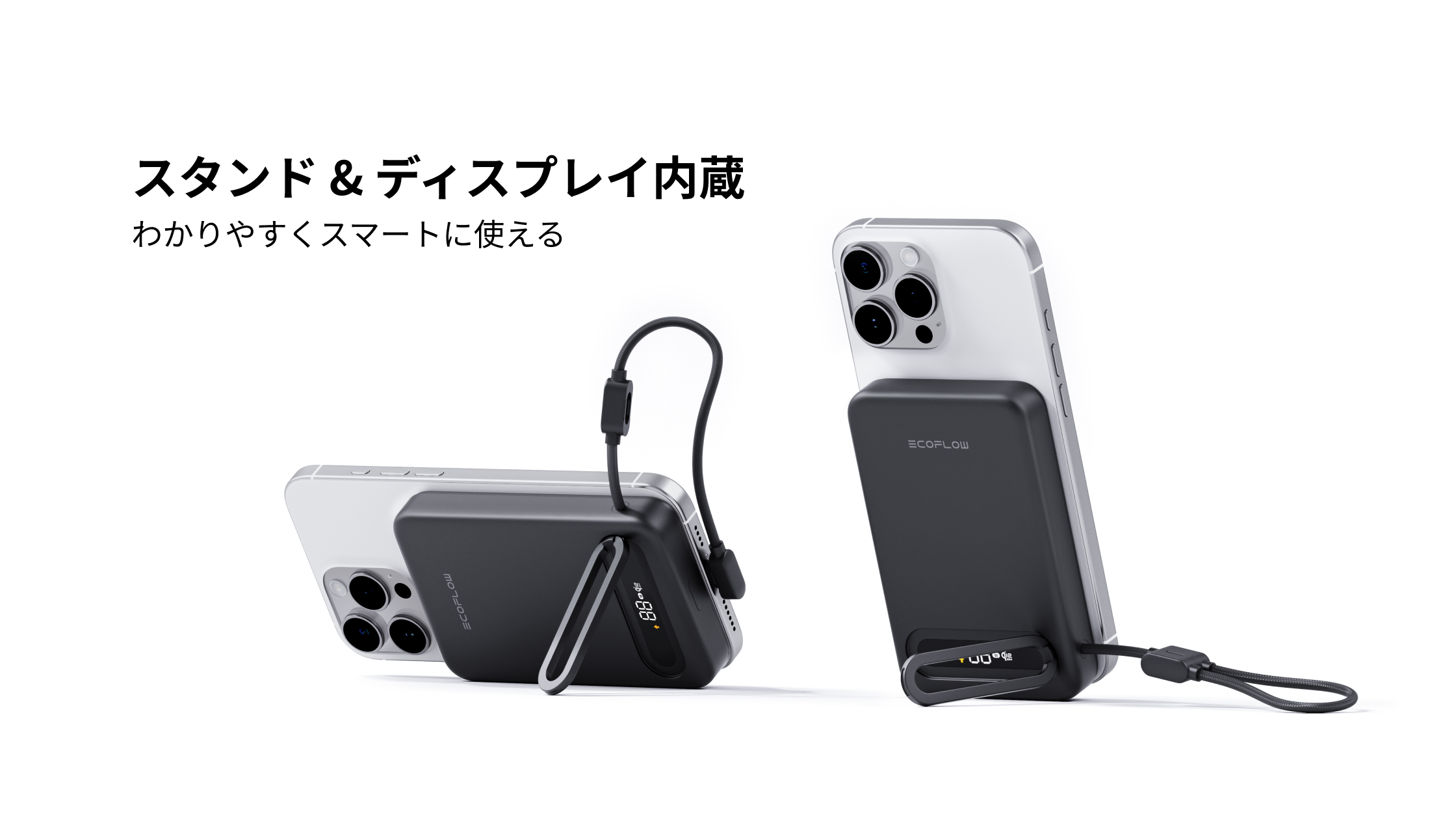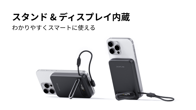 本体に搭載されたディスプレイから、バッテリー残量や出力、充電時間を一目で確認できます。横置きも縦置きもできるキックスタンドも内蔵されており、動画の視聴やビデオ通話/会議などデスクの上でも便利に使えます。