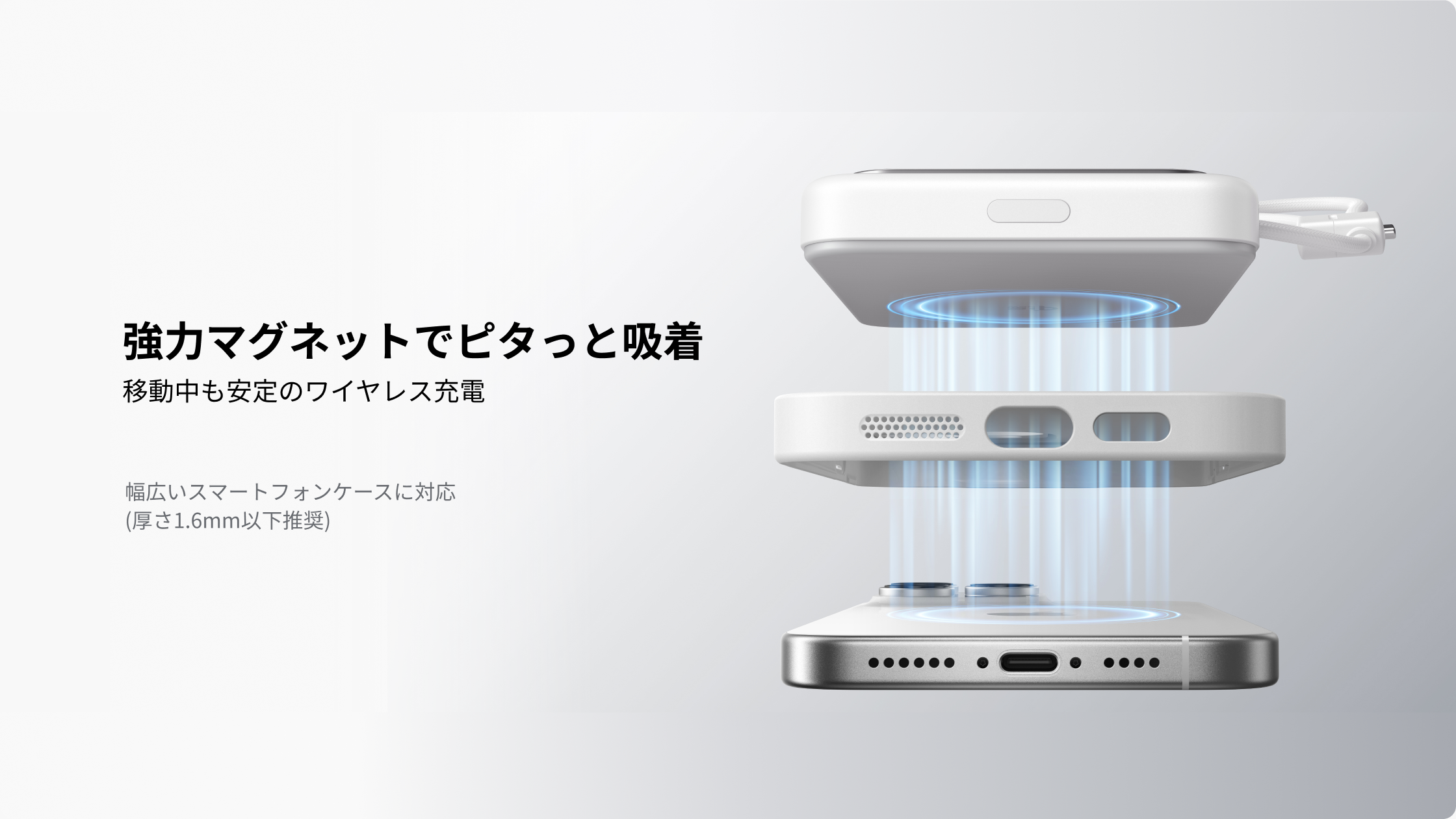 ほとんどの Androidスマートフォンに対応しています。ただし、本製品はAndroidスマートフォン独自のワイヤレス充電プロトコルに対応していません。そのため、より快適にワイヤレス充電をご使用いただくために磁気吸着機能を備えたスマートフォンケースのご使用を推奨します。